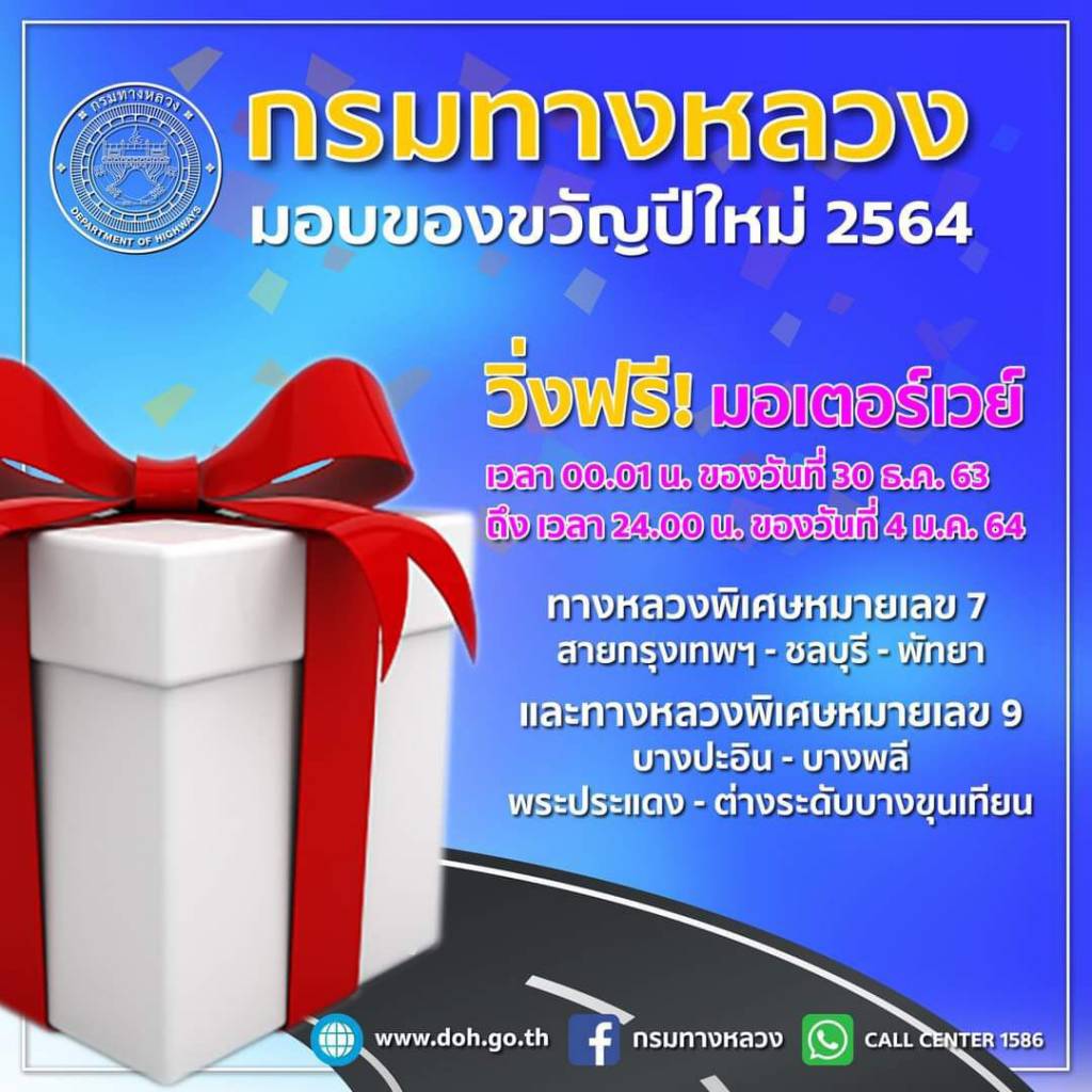 อธิบดีกรมทางหลวง กล่าวต่อไปว่า กรมทางหลวงจะเปิดฟรีมอเตอร์เวย์บนทางหลวงพิเศษหมายเลข 7 กรุงเทพ – ชลบุรี – พัทยา และทางหลวงพิเศษหมายเลข 9 บางปะอิน – บางพลี พระประแดง – ต่างระดับบางขุนเทียนตั้งแต่เวลา 00.01 น. ของวันที่ 30 ธันวาคม 2563 ถึง เวลา 24.00 น. ของวันที่ 4 มกราคม 2564 เพื่อความสะดวกรวดเร็วในการเดินทางในช่วงเทศกาลดังกล่าว โดยผู้ใช้ทางสามารถติดตามการรายงานสภาพจริงการจราจร Online แบบ Real time ผ่านแอพพลิเคชั่น M-Traffic / Thailand Highway Traffic และ QR code รวมทั้ง เฟสบุ๊ก “ศูนย์บริหารจัดการจราจรและอุบัติเหตุกรมทางหลวง” อย่างไรก็ตาม ขอความร่วมมือผู้ใช้ทาง “ชีวิตวิถีใหม่ ขับขี่อย่างปลอดภัย ไร้อุบัติเหตุ” ขับขี่ด้วยความระมัดระวังปฏิบัติตามกฎจราจร วางแผนการเดินทางล่วงหน้า เตรียมร่างกายให้พร้อม เพื่อความปลอดภัยของท่านและผู้ร่วมทาง