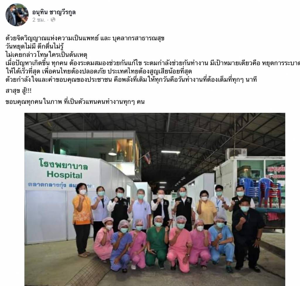 โดยก่อนหน้านี้ นายอนุทิน ได้โพสต์เฟซบุ๊ก เพื่อให้กำลังใจบุคลากรสาธารณสุข ในการควบคุมการระบาดของโควิด- 19 โดยมีภาพการทำงานของทีมแพทย์ พยาบาลและทุกภาคส่วนที่เกี่ยวข้อง พร้อมข้อความ ระบุว่า