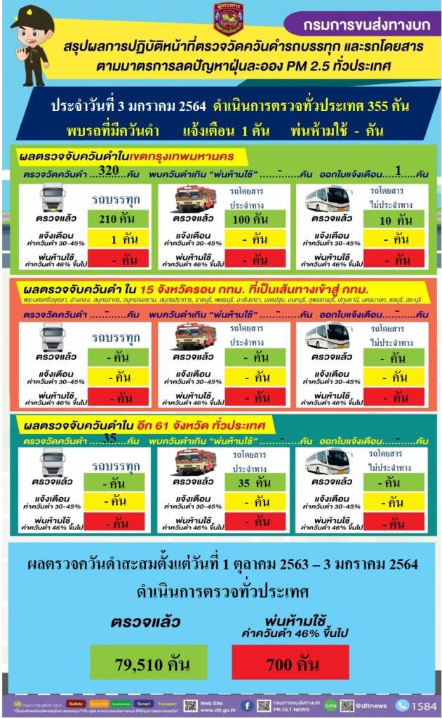 วันนี้ (3 มกราคม 2564) นายจิรุตม์ วิศาลจิตร อธิบดีกรมการขนส่งทางบก เผยผลการดำเนินการตรวจควันดำรถบรรทุกและรถโดยสารทั่วประเทศ ซึ่งเป็นการดำเนินการต่อเนื่อง ตามนโยบายของนายศักดิ์สยาม ชิดชอบ รัฐมนตรีว่าการกระทรวงคมนาคม เพื่อป้องกันและแก้ไขปัญหาฝุ่นละอองขนาดเล็ก PM2.5 เฉพาะวันที่ 3 มกราคม 2564 ดำเนินการตรวจวัดควันดำรถโดยสารและรถบรรทุกทั่วประเทศ จำนวน 355 คัน พบรถที่มีค่าควันดำเกินเกณฑ์มาตรฐานที่ราชการกำหนด พ่นห้ามใช้ ไม่พบ ในขณะที่พบรถที่มีค่าควันดำ 30 - 45 % ได้ออกใบเตือนเพื่อให้ผู้ประกอบการไปบำรุงดูแลรักษารถไม่ให้มีค่าควันดำเกิน จำนวน 1 คัน ส่งผลให้ตั้งแต่วันที่1 ตุลาคม – 3 มกราคม 2564 ดำเนินการตรวจควันดำรถทั้งสิ้น 79,510 คัน พ่นห้ามใช้แล้วจำนวน 700 คัน