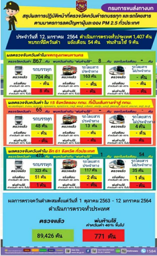 กรมการขนส่งทางบก ตรวจควันดำรถบรรทุกและรถโดยสารต่อเนื่องทั่วประเทศ มุ่งป้องกันและแก้ไขปัญหา PM2.5 พบรถที่มีค่าควันดำ 30 - 45 % ได้ออกใบเตือนเพื่อให้ผู้ประกอบการไปบำรุงดูแลรักษารถไม่ให้มีค่าควันดำเกิน จำนวน 54 คัน