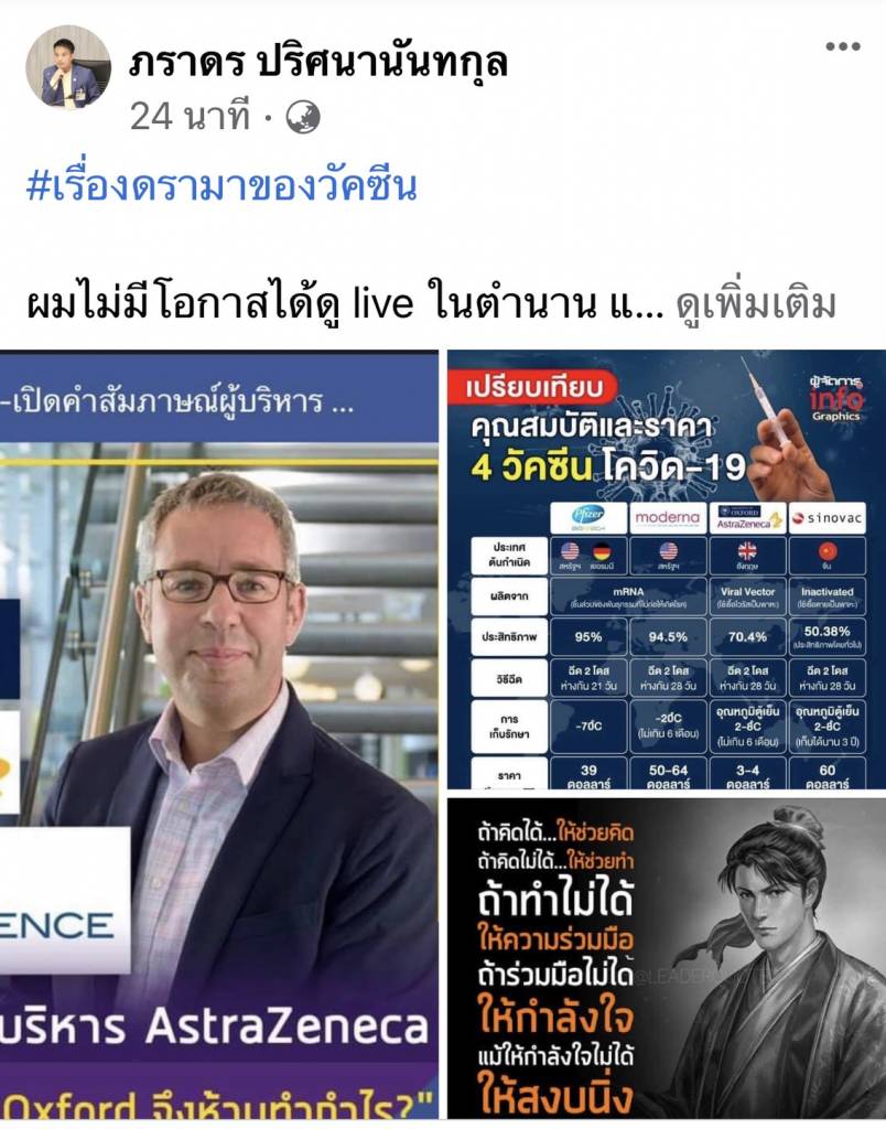 เมื่อวันที่ 20 มค. นายภราดร ปริศนานันทกุล ส.ส.อ่างทอง ในฐานะ โฆษกพรรคภูมิใจไทย โพสต์เฟสบุ๊คส่วนตัว#เรื่องดรามาของวัคซีนว่า