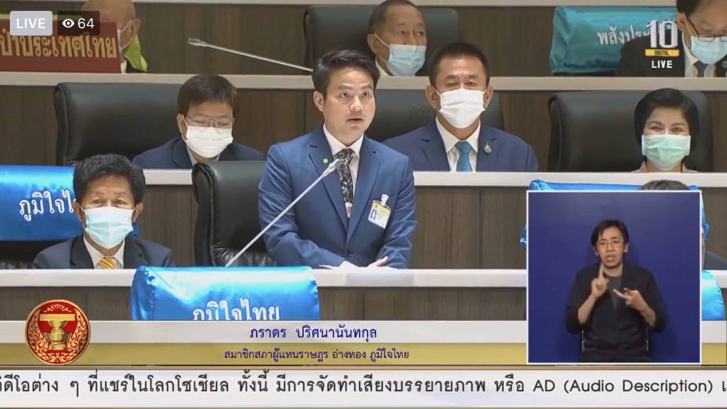 นายภราดร ปริศนานันทกุล สมาชิกสภาผู้แทนราษฎรจังหวัดอ่างทอง พรรคภูมิใจไทย หารือถึงเรื่องมาตรการเยียวยาพี่น้องประชาชนสำหรับผู้ที่ได้รับผลกระทบจากโควิด-19 ซึ่งรัฐบาลนั้นได้มีมาตรการในการช่วยเหลือ 3,500 บาทต่อเดือนต่อคน แต่ว่าพี่น้องประชาชนได้ร้องเรียนว่าด้วยกระบวนการ และวิธีการต่างๆที่ได้กำหนดไว้นั้น คือรัฐบาลจะให้เงินกับพี่น้องประชาชนเป็นรายสัปดาห์ เพื่อนำไปจับจ่ายใช้สอยในชีวิตประจำวัน รวมถึงสามารถที่จะนำเงินไปใช้กับโครงการคนละครึ่งได้ แต่ประชาชนร้องเรียนว่า อยากได้เป็นเงินสด และเป็นจำนวนเต็มเลย ได้หรือไม่ เพราะสิ่งที่เขาได้รับผลกระทบนั้นมีมากมายกว่ามากกว่าการใช้ชีวิตประจำวัน ต้องนำเงินเพื่อไปใช้หนี้ใช้สินที่ไปกู้ยืมมา ซึ่งสามารถที่จะตอบโจทย์ในการช่วยเหลือเยียวยาได้มากกว่า
