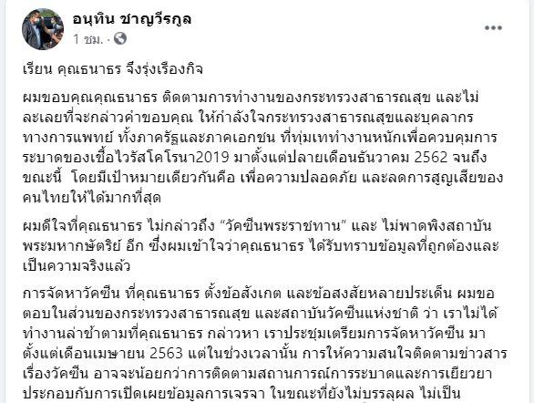 เมื่อวันที่ 26 มกราคม 2564 ผู้สื่อข่าวรายงานที่ว่าที่เฟซบุ๊ก “อนุทิน ชาญวีรกูล” ของนายอนุทิน ชาญวีรกูล รองนายกรัฐมนตรี และรัฐมนตรีว่าการกระทรวงสาธารณสุข ได้มีการตอบคำถามนายธนาธร จึงรุ่งเรืองกิจ ประธานคณะก้าวหน้า ในประเด็นเรื่องการจัดหาวัคซีนโควิด-19 ดังนี้