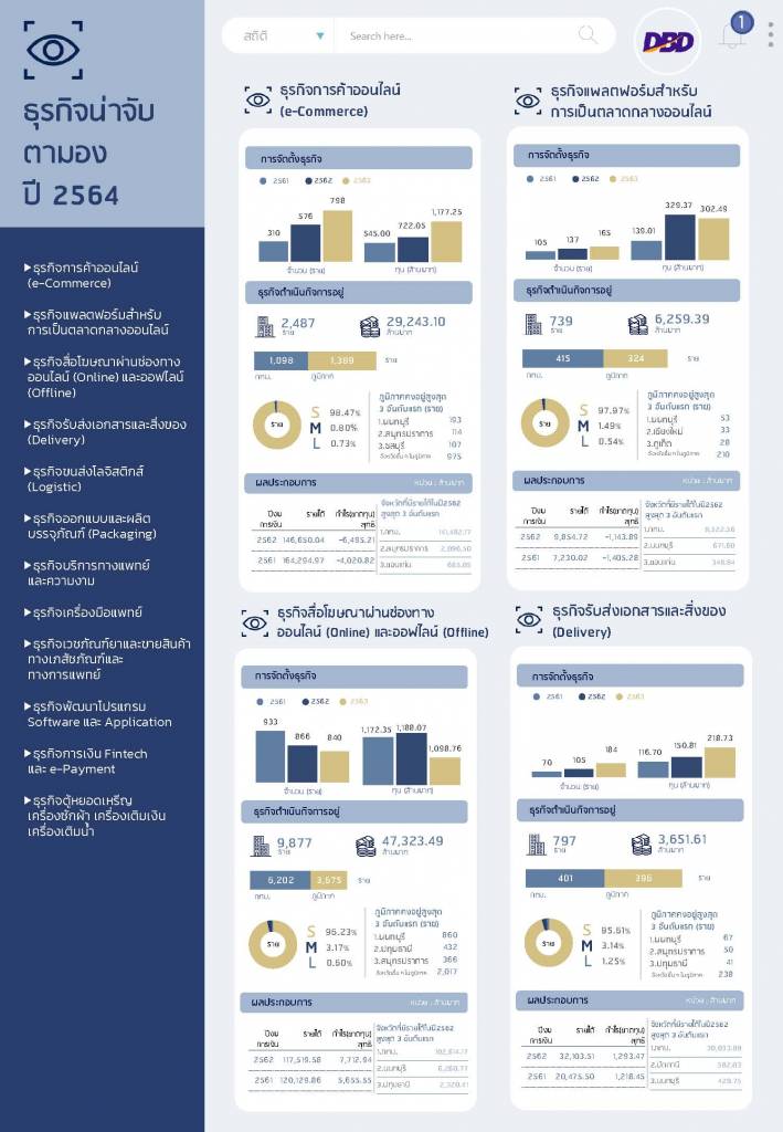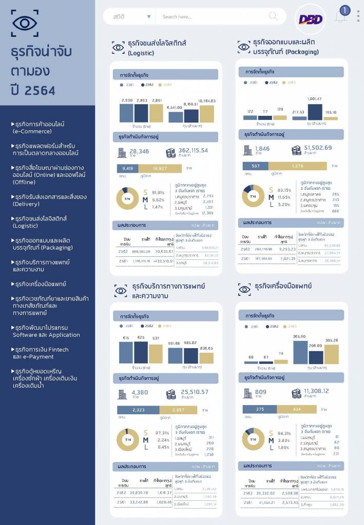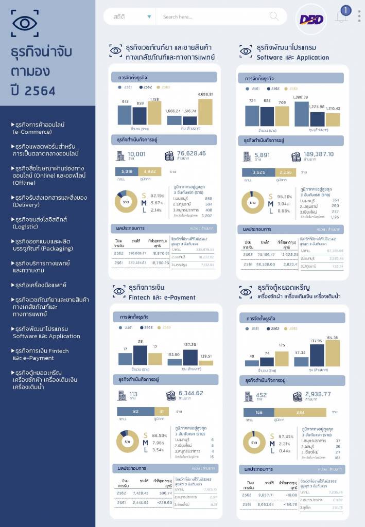 ทุนจดทะเบียนรวม 812,213.46 ล้านบาท แบ่งเป็น * ธุรกิจการค้าออนไลน์ (e-Commerce) จำนวน 2,487 ราย ทุนจดทะเบียนรวม 29,243.10 ล้านบาท * ธุรกิจแพลตฟอร์มสำหรับการเป็นตลาดกลางออนไลน์ จำนวน 739 ราย ทุนจดทะเบียนรวม 6,259.39 ล้านบาท * ธุรกิจสื่อโฆษณาผ่านช่องทางออนไลน์ (Online) และ ออฟไลน์ (Offline) จำนวน 9,877 ราย ทุนจดทะเบียนรวม 47,323.49 ล้านบาท * ธุรกิจรับส่งเอกสารและสิ่งของ (Delivery) จำนวน 797 ราย ทุนจดทะเบียนรวม 3,651.61 ล้านบาท * ธุรกิจขนส่งโลจิสติกส์ จำนวน 28,346 ราย ทุนจดทะเบียนรวม 362,115.54 ล้านบาท * ธุรกิจออกแบบและผลิตบรรจุภัณฑ์ (Packaging) จำนวน 1,846 ราย ทุนจดทะเบียนรวม 51,502.69 ล้านบาท * ธุรกิจบริการทางการแพทย์และความงาม จำนวน 4,380 ราย ทุนจดทะเบียนรวม 25,510.57 ล้านบาท * ธุรกิจเกี่ยวกับเครื่องมือแพทย์ จำนวน 809 ราย ทุนจดทะเบียนรวม 11,308.12 ล้านบาท * ธุรกิจเวชภัณฑ์ยาและธุรกิจขายส่งสินค้าทางเภสัชภัณฑ์และทางการแพทย์ จำนวน 10,001 ราย ทุนจดทะเบียนรวม 76,628.46 ล้านบาท * ธุรกิจพัฒนาโปรแกรม Software และ Application จำนวน 5,891 ราย ทุนจดทะเบียนรวม 189,387.10 ล้านบาท * ธุรกิจการเงิน Fintech และ e-Payment จำนวน 113 ราย ทุนจดทะเบียนรวม 6,344.62 ล้านบาท และ * ธุรกิจตู้หยอดเหรียญ เช่น ร้านสะดวกซัก เครื่องเติมเงิน เครื่องเติมน้ำ จำนวน 452 ราย ทุนจดทะเบียนรวม 2,938.77 ล้านบาท”