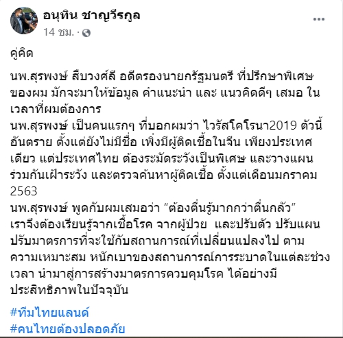 นพ.สุรพงษ์ เป็นคนแรกๆ ที่บอกผมว่า ไวรัสโคโรนา2019 ตัวนี้อันตราย ตั้งแต่ยังไม่มีชื่อ เพิ่งมีผู้ติดเชื้อในจีน เพียงประเทศเดียว แต่ประเทศไทย ต้องระมัดระวังเป็นพิเศษ และวางแผนร่วมกันเฝ้าระวัง และตรวจค้นหาผู้ติดเชื้อ ตั้งแต่เดือนมกราคม 2563