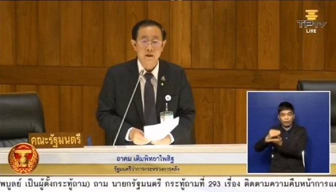 นายอาคม ชี้แจงสั้น ๆ เพียง ว่า ร่าง พ.ร.บ.กยศ. ของพรรคภูมิใจไทย นั้น มีความเห็นของแต่ละหน่วยงานมีข้อสังเกตที่จะต้องทำความเข้าใจ สำนักงานคณะกรรมการกฤษฎีกา ให้ความเห็นว่า เป็นเรื่องของหน่วยงานที่เกี่ยวข้อง และทางสมาชิกส่งร่างนี้มาที่กระทรวงการคลัง เพิ่งได้รับเมื่อไม่กี่วันนี้เอง กระทรวงการคลังต้องมีการหารืออีกครั้ง ระหว่างหน่วยงาน กระทรวงการคลัง ขอรับไปเพื่อดูความเห็นของหน่วยงานต่างๆ