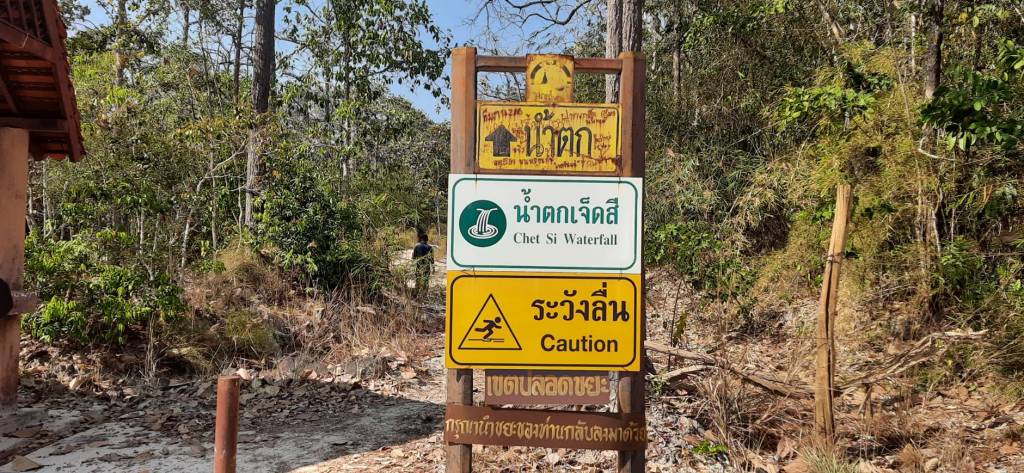 จากจุดจอดรถเดินเข้าไปถึงบริเวณนที่เล่นน้ำตกประมาณ 800 เมตร จะถึงน้ำตกชั้นแรก ส่วนน้ำตกชั้นที่ 2 ห่างไปเพียง 200 เมตร มีลักษณะเป็นลานหินน้ำตก ส่วนน้ำตกชั้นที่ 3 เป็นชั้นที่สวยที่สุด และเป็นที่มาของชื่อน้ำตกเจ็ดสี อยู่ห่างจากลานน้ำตกชั้นที่ 2 ประมาณ 200เมตร