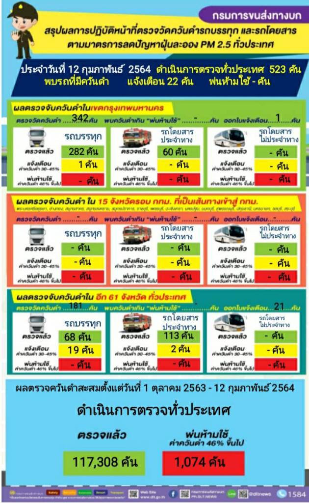 วันที่ 12 กุมภาพันธ์ 2564 นายจิรุตม์ วิศาลจิตร อธิบดีกรมการขนส่งทางบก เผยผลการดำเนินการตรวจควันดำรถบรรทุกและรถโดยสารทั่วประเทศ ซึ่งเป็นการดำเนินการต่อเนื่อง ตามนโยบายของนายศักดิ์สยาม ชิดชอบ รัฐมนตรีว่าการกระทรวงคมนาคม เพื่อป้องกันและแก้ไขปัญหาฝุ่นละอองขนาดเล็ก PM2.5 เฉพาะวันที่ 12 กุมภาพันธ์ 2564 ดำเนินการตรวจวัดควันดำรถโดยสารและรถบรรทุกทั่วประเทศ จำนวน 523 คัน ไม่พบรถที่มีค่าควันดำเกินเกณฑ์มาตรฐานที่ราชการกำหนด ในขณะที่พบรถที่มีค่าควันดำ 30 - 45 % ได้ออกใบเตือนเพื่อให้ผู้ประกอบการไปบำรุงดูแลรักษารถไม่ให้มีค่าควันดำเกิน จำนวน 22 คัน ส่งผลให้ตั้งแต่วันที่ 1 ตุลาคม – 12 กุมภาพันธ์ 2564ดำเนินการตรวจควันดำรถทั้งสิ้น 117,308 คัน พ่นห้ามใช้แล้วจำนวน 1,074 คัน ทั้งนี้ กำชับผู้ประกอบการและเจ้าของรถทุกคันที่ถูกพ่นห้ามใช้ ต้องนำรถไปแก้ไขและนำรถเข้ารับการตรวจสภาพ ณ สำนักงานขนส่ง หากฝ่าฝืนใช้รถโดยที่มีคำสั่งห้ามใช้ มีความผิดตามกฎหมาย ด้านประชาชนสามารถมีส่วนร่วมป้องกันและแก้ไขปัญหาฝุ่นละอองขนาดเล็ก PM2.5 ด้วยการส่งภาพรถบรรทุกและรถโดยสารควันดำที่สังเกตเห็นหมายเลขทะเบียนชัดเจน ให้ศูนย์คุ้มครองผู้โดยสารและรับเรื่องร้องเรียน สายด่วน 1584 ตลอด 24 ชั่วโมง •Line@: @1584DLT •Facebook: 1584 ร้องเรียนรถโดยสารสาธารณะ https://www.facebook.com/dlt1584/ •เว็บไซต์ http://ins.dlt.go.th/cmpweb/ •แอปพลิเคชัน DLT GPS •E-mail: dlt_1584complain@hotmail.com