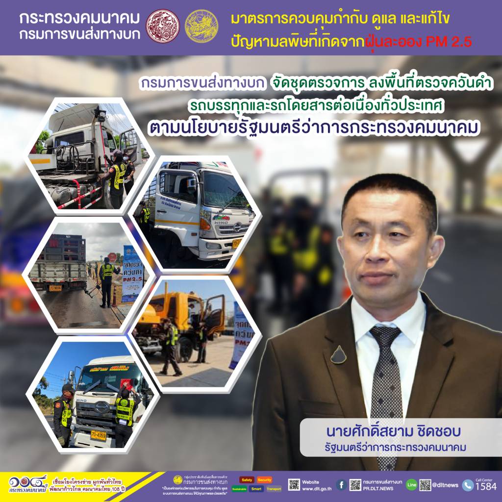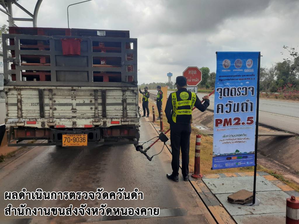 กรมการขนส่งทางบก ตรวจควันดำรถบรรทุกและรถโดยสารต่อเนื่องทั่วประเทศ มุ่งป้องกันและแก้ไขปัญหา PM2.5 พบรถที่มีค่าควันดำ 30 - 45 % ได้ออกใบเตือน 22 คัน