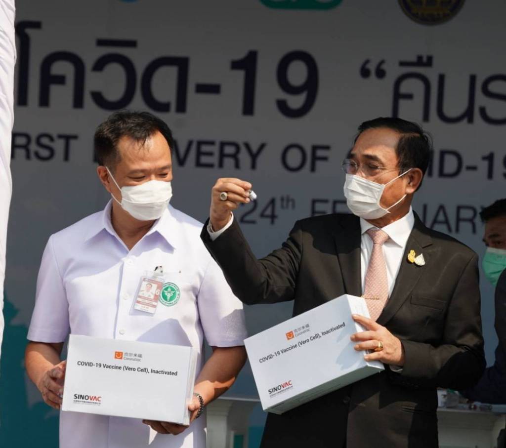 พล.อ.ประยุทธ์ กล่าวว่า วันนี้วัคซีนล็อตแรกที่รัฐบาลได้มอบให้กระทรวงสาธารณสุข โดยองค์การเภสัชกรรม จัดหาเร่งด่วน จำนวน 2 ล้านโดส รองรับการแพร่ระบาดโรคโควิด-19 ระลอกใหม่ เพิ่มจากแผนจัดหาเดิม ที่กรมควบคุมโรคสั่งซื้อจากบริษัท Astra Zenica โดยวัคซีนนี้เกิดจากการเจรจากับบริษัท ซิโนแวค ไลฟ์ ชายน์ จำกัด สาธารณรัฐประชาชนจีน Sinovac Life Sciences Co.,LTD.,People’s Republic of Chaina) ซึ่งเป็นบริษัทที่สามารถส่งวัคซีนให้ประเทศไทยได้ภายในเดือน ก.พ. 2564 ภายใต้การจัดหาโดยสถานทูตสาธารณรัฐประชาชนจีน ประจำประเทศไทย และมอบให้องค์การเภสัชกรรม เป็นผู้ดำเนินการนำเข้า ขึ้นทะเบียนยากับสำนักงานคณะกรรมการอาหารและยา และกระจายไปสู่ประชาชน ฉีดให้กลุ่มเป้าหมายคนละ 2 โดส ห่างกัน 21 วัน และในเดือน มิ.ย. จะได้รับวัคซีนของแอสตร้าเซนิก้า 61 ล้านโดส เพื่อฉีดให้ทุกคนบนแผ่นดินไทยโดยสมัครใจ สร้างภูมิคุ้มกันโรค ฟื้นเศรษฐกิจ คืนรอยยิ้มให้กับประเทศไทย