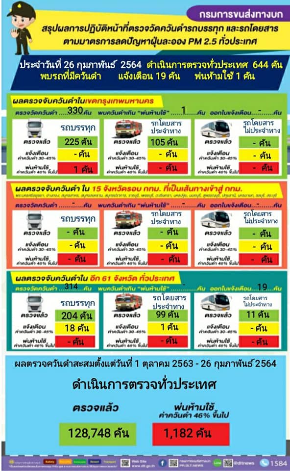 วันนี้ (26 กุมภาพันธ์ 2564) นายจิรุตม์ วิศาลจิตร อธิบดีกรมการขนส่งทางบก เผยผลการดำเนินการตรวจควันดำรถบรรทุกและรถโดยสารทั่วประเทศ ซึ่งเป็นการดำเนินการต่อเนื่อง ตามนโยบายของนายศักดิ์สยาม ชิดชอบ รัฐมนตรีว่าการกระทรวงคมนาคม เพื่อป้องกันและแก้ไขปัญหาฝุ่นละอองขนาดเล็ก PM2.5 เฉพาะวันที่ 26 กุมภาพันธ์ 2564 ดำเนินการตรวจวัดควันดำรถโดยสารและรถบรรทุกทั่วประเทศ จำนวน 644 คัน พบรถที่มีค่าควันดำเกินเกณฑ์มาตรฐานที่ราชการกำหนด จำนวน 1 คัน ในขณะที่พบรถที่มีค่าควันดำ 30 - 45 % ได้ออกใบเตือนเพื่อให้ผู้ประกอบการไปบำรุงดูแลรักษารถไม่ให้มีค่าควันดำเกิน จำนวน 19 คัน ส่งผลให้ตั้งแต่วันที่ 1 ตุลาคม – 26 กุมภาพันธ์ 2564ดำเนินการตรวจควันดำรถทั้งสิ้น 128,748 คัน พ่นห้ามใช้แล้วจำนวน 1,182 คัน ทั้งนี้ กำชับผู้ประกอบการและเจ้าของรถทุกคันที่ถูกพ่นห้ามใช้ ต้องนำรถไปแก้ไขและนำรถเข้ารับการตรวจสภาพ ณ สำนักงานขนส่ง หากฝ่าฝืนใช้รถโดยที่มีคำสั่งห้ามใช้ มีความผิดตามกฎหมาย ด้านประชาชนสามารถมีส่วนร่วมป้องกันและแก้ไขปัญหาฝุ่นละอองขนาดเล็ก PM2.5 ด้วยการส่งภาพรถบรรทุกและรถโดยสารควันดำที่สังเกตเห็นหมายเลขทะเบียนชัดเจน ให้ศูนย์คุ้มครองผู้โดยสารและรับเรื่องร้องเรียน สายด่วน 1584 ตลอด 24 ชั่วโมง •Line@: @1584DLT •Facebook: 1584 ร้องเรียนรถโดยสารสาธารณะ https://www.facebook.com/dlt1584/ •เว็บไซต์ http://ins.dlt.go.th/cmpweb/ •แอปพลิเคชัน DLT GPS •E-mail: dlt_1584complain@hotmail.com