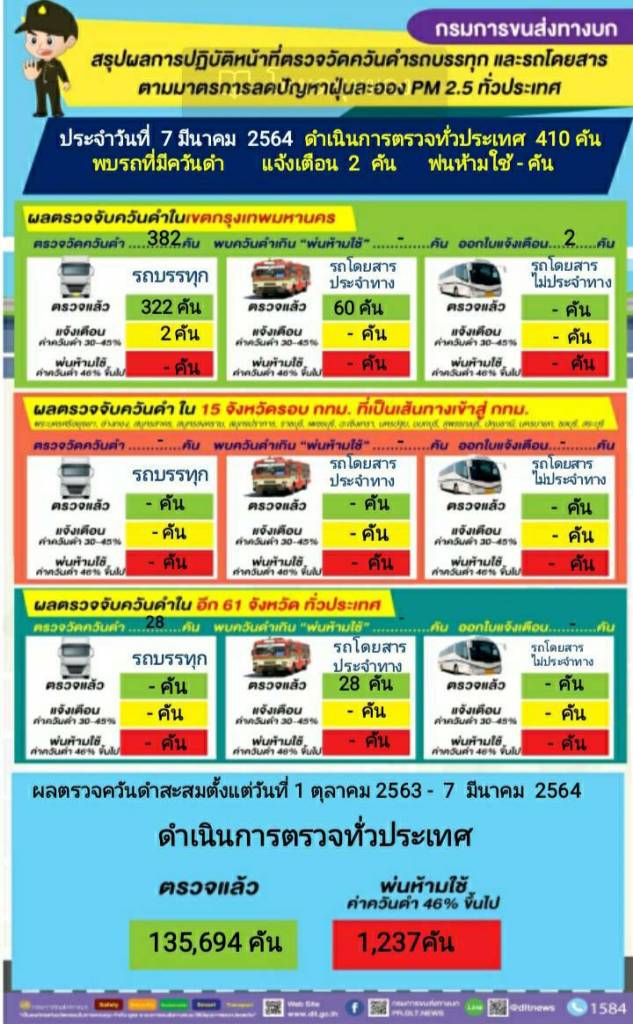 เมื่อวันที่ 7 มีนาคม 2564 นายจิรุตม์ วิศาลจิตร อธิบดีกรมการขนส่งทางบก เผยผลการดำเนินการตรวจควันดำรถบรรทุกและรถโดยสารทั่วประเทศ ซึ่งเป็นการดำเนินการต่อเนื่อง ตามนโยบายของนายศักดิ์สยาม ชิดชอบ รัฐมนตรีว่าการกระทรวงคมนาคม เพื่อป้องกันและแก้ไขปัญหาฝุ่นละอองขนาดเล็ก PM2.5 เฉพาะวันที่ 7 มีนาคม 2564 ดำเนินการตรวจวัดควันดำรถโดยสารและรถบรรทุกทั่วประเทศ จำนวน 410 คัน ไม่พบรถที่มีค่าควันดำเกินเกณฑ์มาตรฐานที่ราชการกำหนด ในขณะที่พบรถที่มีค่าควันดำ 30 - 45 % ได้ออกใบเตือนเพื่อให้ผู้ประกอบการไปบำรุงดูแลรักษารถไม่ให้มีค่าควันดำเกิน จำนวน 2 คัน ส่งผลให้ตั้งแต่วันที่ 1 ตุลาคม – 7 มีนาคม 2564 ดำเนินการตรวจควันดำรถทั้งสิ้น 135,694 คัน พ่นห้ามใช้แล้วจำนวน 1,237 คัน ทั้งนี้ กำชับผู้ประกอบการและเจ้าของรถทุกคันที่ถูกพ่นห้ามใช้ ต้องนำรถไปแก้ไขและนำรถเข้ารับการตรวจสภาพ ณ สำนักงานขนส่ง หากฝ่าฝืนใช้รถโดยที่มีคำสั่งห้ามใช้ มีความผิดตามกฎหมาย ด้านประชาชนสามารถมีส่วนร่วมป้องกันและแก้ไขปัญหาฝุ่นละอองขนาดเล็ก PM2.5 ด้วยการส่งภาพรถบรรทุกและรถโดยสารควันดำที่สังเกตเห็นหมายเลขทะเบียนชัดเจน ให้ศูนย์คุ้มครองผู้โดยสารและรับเรื่องร้องเรียน สายด่วน 1584 ตลอด 24 ชั่วโมง •Line@: @1584DLT •Facebook: 1584 ร้องเรียนรถโดยสารสาธารณะ https://www.facebook.com/dlt1584/ •เว็บไซต์ http://ins.dlt.go.th/cmpweb/ •แอปพลิเคชัน DLT GPS •E-mail: dlt_1584complain@hotmail.com