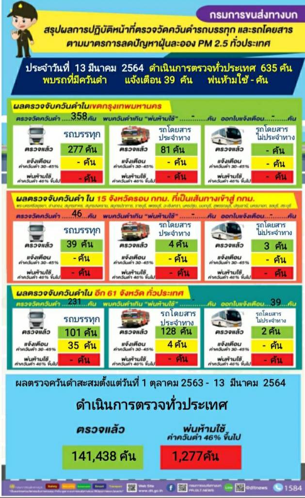 กรมการขนส่งทางบก ตรวจควันดำรถบรรทุกและรถโดยสารต่อเนื่องทั่วประเทศ มุ่งป้องกันและแก้ไขปัญหา PM2.5 พบรถที่มีค่าควันดำ 30 - 45 %  ออกใบเตือนจำนวน 39 คัน จาก จำนวน 635 คัน