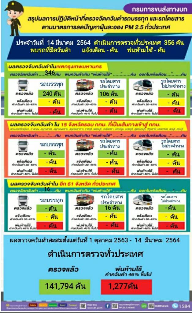 วันนี้ (14 มีนาคม 2564) นายจิรุตม์ วิศาลจิตร อธิบดีกรมการขนส่งทางบก เผยผลการดำเนินการตรวจควันดำรถบรรทุกและรถโดยสารทั่วประเทศ ซึ่งเป็นการดำเนินการต่อเนื่อง ตามนโยบายของนายศักดิ์สยาม ชิดชอบ รัฐมนตรีว่าการกระทรวงคมนาคม เพื่อป้องกันและแก้ไขปัญหาฝุ่นละอองขนาดเล็ก PM2.5 เฉพาะวันที่ 14 มีนาคม 2564 ดำเนินการตรวจวัดควันดำรถโดยสารและรถบรรทุกทั่วประเทศ จำนวน 356 คัน ไม่พบรถที่มีค่าควันดำเกินเกณฑ์มาตรฐานที่ราชการกำหนด ส่งผลให้ตั้งแต่วันที่ 1 ตุลาคม – 14 มีนาคม 2564 ดำเนินการตรวจควันดำรถทั้งสิ้น 141,794 คัน พ่นห้ามใช้แล้วจำนวน1,277 คัน