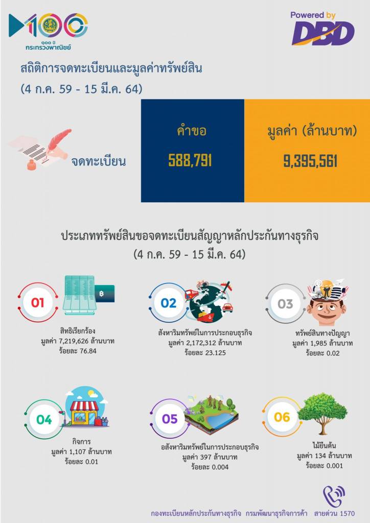 สถิติการจดทะเบียนสัญญาหลักประกันทางธุรกิจ (4 กรกฎาคม 2559 - 15 มีนาคม2564) มีผู้มาขอจดทะเบียนสัญญาหลักประกันทางธุรกิจแล้ว จำนวน 588,791 คำขอจำนวนเงินสูงสุดที่ใช้ทรัพย์สินเป็นหลักประกัน รวมทั้งสิ้น 9,395,561 ล้านบาท โดยสิทธิเรียกร้องยังคงเป็นทรัพย์สินที่ใช้เป็นหลักประกันมากที่สุด คิดเป็นร้อยละ 76.84 (มูลค่า7,219,626 ล้านบาท) รองลงมา สังหาริมทรัพย์ที่ใช้ในการประกอบธุรกิจ ได้แก่ สินค้าคงคลัง วัตถุดิบ เครื่องจักร รถยนต์ เรือ เครื่องบิน สัตว์พาหนะ คิดเป็นร้อยละ 23.125 (มูลค่า 2,172,312 ล้านบาท) ทรัพย์สินทางปัญญา คิดเป็นร้อยละ 0.02 (มูลค่า 1,985 ล้านบาท) กิจการ คิดเป็นร้อยละ 0.01 (มูลค่า 1,107 ล้านบาท) อสังหาริมทรัพย์ที่ใช้ในการประกอบธุรกิจ คิดเป็นร้อยละ 0.004 (มูลค่า 397 ล้านบาท) และ ไม้ยืนต้น คิดเป็นร้อยละ 0.001 (มูลค่า 134 ล้านบาท)