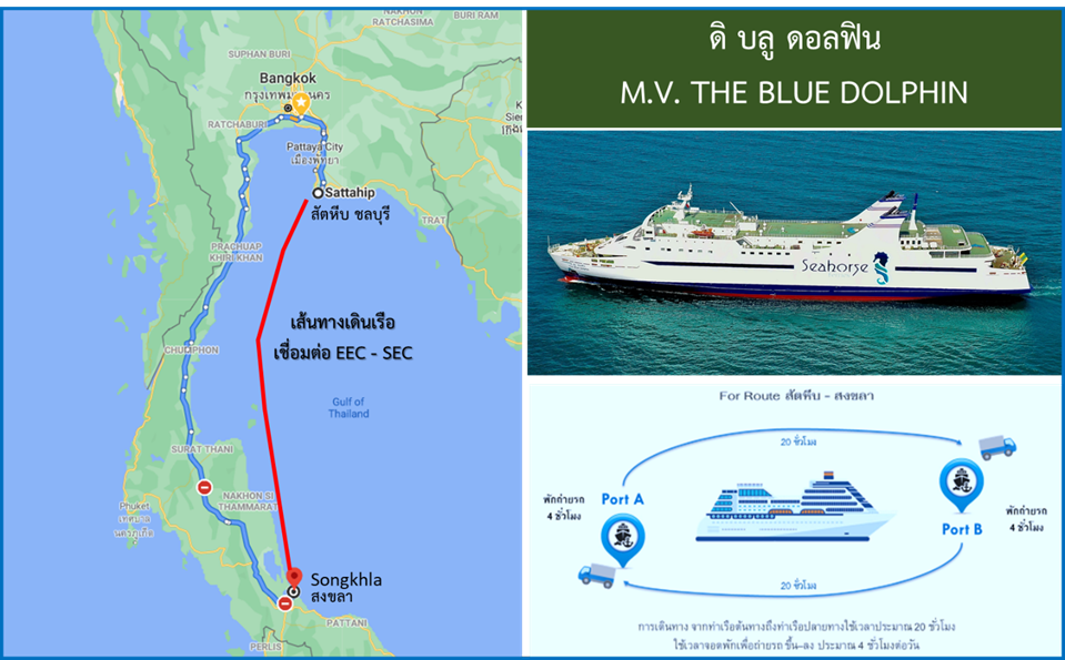 การประชุมครั้งนี้ เป็นการประชุมเพื่อติดตามความคืบหน้าในการเตรียมการเปิดเส้นทางให้บริการ การขนส่งทางน้ำ ระหว่างจังหวัดชลบุรี (ท่าเรือพาณิชย์สัตหีบ) - จังหวัดประจวบคีรีขันธ์ – จังหวัดสงขลา ซึ่งมีบริษัท ซี ฮอร์ส เฟอร์รี่ จำกัด ให้ความสนใจเดินเรือในเส้นทางดังกล่าว โดยใช้เรือ ดิ บลู ดอลฟิน ความยาว 136.60 เมตร ขนาด 7,003 ตันกรอส ความเร็ว 17 น๊อต (31.48 กิโลเมตรต่อชั่วโมง) ซึ่งได้รับการตรวจรับรองความปลอดภัยจากกรมเจ้าท่าแล้วเมื่อวันที่ 12 มีนาคม 2564 และคนประจำเรือได้รับการฝึกอบรม ตามข้อกำหนด มีความพร้อมในการปฏิบัติงาน ในระยะแรกจะเดินเรือในเส้นทางระหว่างจังหวัดชลบุรี – จังหวัดสงขลา โดยออกเดินทางจากท่าเรือพาณิชย์สัตหีบไปยังจังหวัดสงขลา และจะขยายเส้นทางเชื่อมโยง เข้ากับจังหวัดประจวบคีรีขันธ์ในระยะต่อไป ปัจจุบันเรือ ดิ บลู ดอลฟิน ได้รับการยกเว้นภาษีมูลค่าเพิ่มจาก BOI แล้ว และจะได้เคลื่อนย้ายเรือเพื่อไปทดลองการเดินเรือที่ท่าเรือพาณิชย์สัตหีบ คาดว่าจะทดสอบแล้วเสร็จ ในเดือนมีนาคม 2564 และจะมีกิจกรรม Meet the Press ในช่วงเดือนเมษายน 2564 โดยรัฐมนตรีว่าการกระทรวงคมนาคมได้รับทราบความคืบหน้าในการดำเนินการการให้บริการการขนส่งทางน้ำฯและได้สั่งการเพิ่มเติม ดังนี้