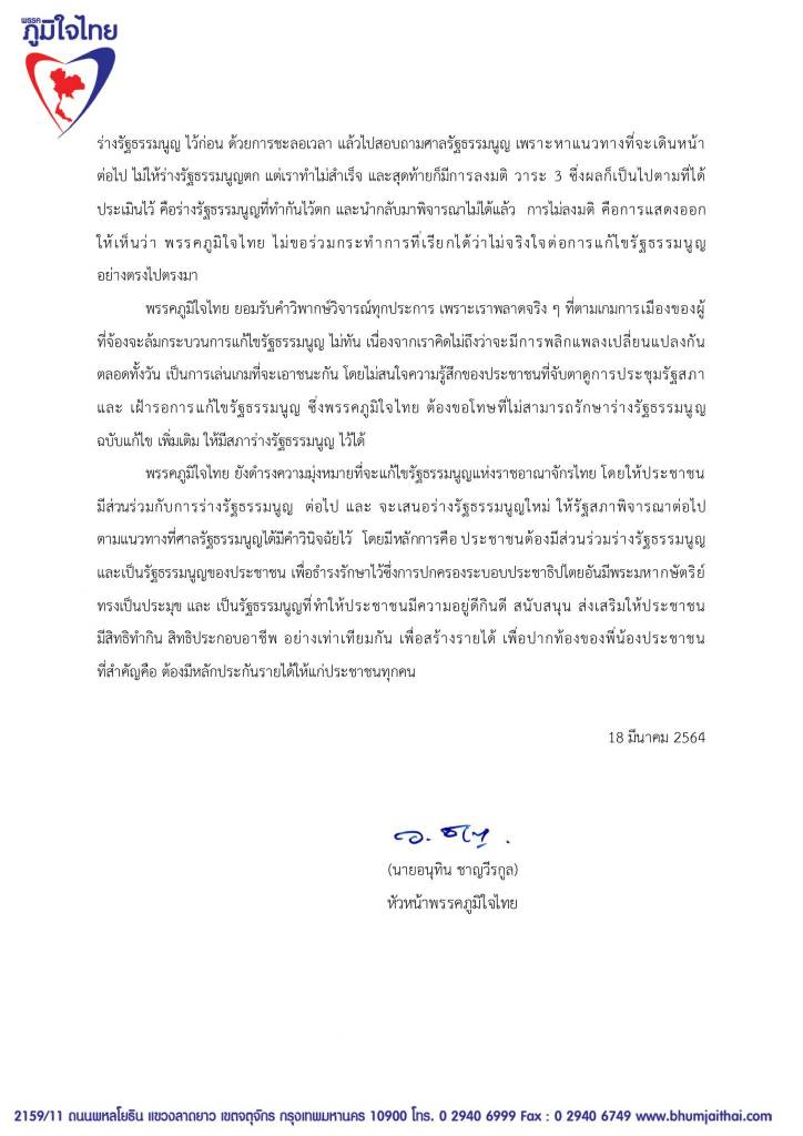 ตอนท้ายแถลงการณ์ฉบับนี้ ลงวันที่ 18 มีนาคม 2564 ลงนามโดยนายอนุทิน ชาญวีรกูล หัวหน้าพรรคภูมิใจไทย