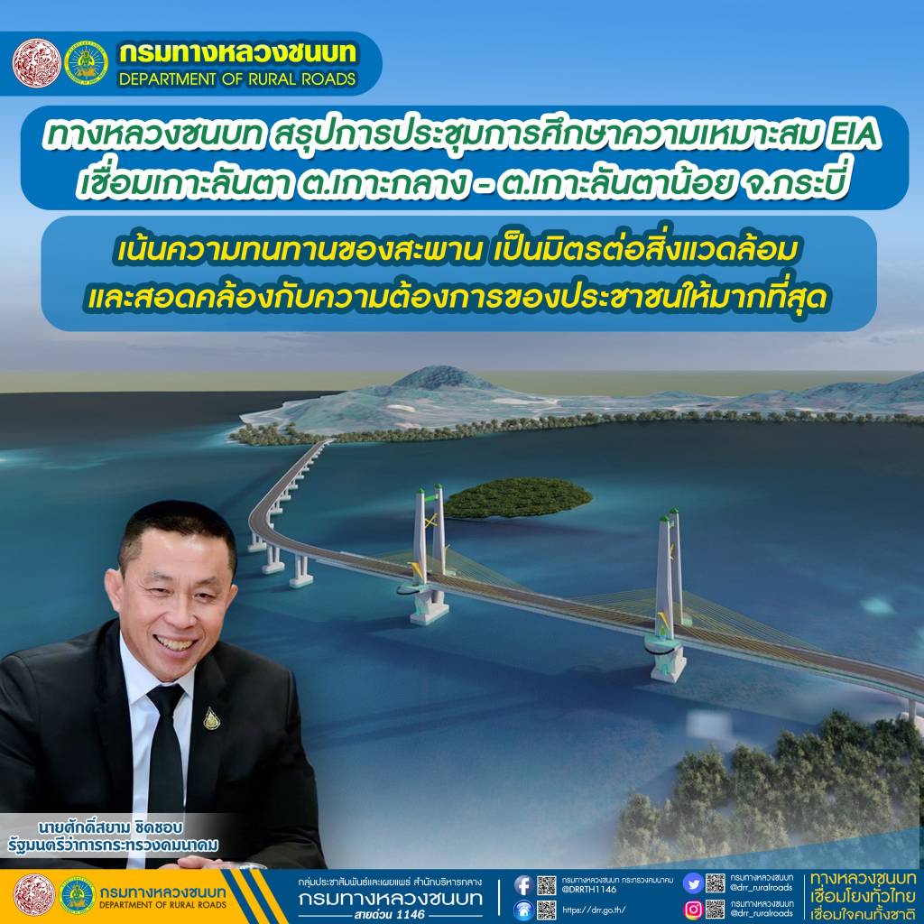 ทางหลวงชนบท สรุปการประชุมการศึกษาความเหมาะสม EIA เชื่อมเกาะลันตา ต.เกาะกลาง - ต.เกาะลันตาน้อย จ.กระบี่ เน้นความทนทานของสะพานเป็นมิตรต่อสิ่งแวดล้อมและสอดคล้องกับความต้องการของประชาชนให้มากที่สุด ตามนโยบาย รมว.คมนาคม