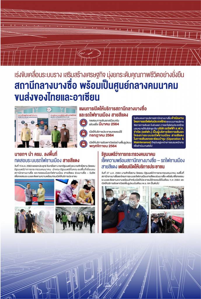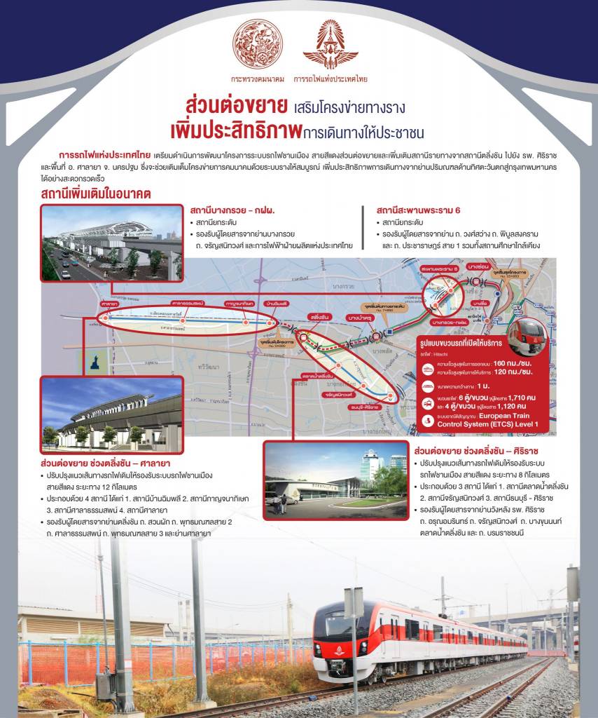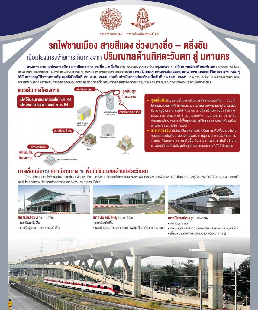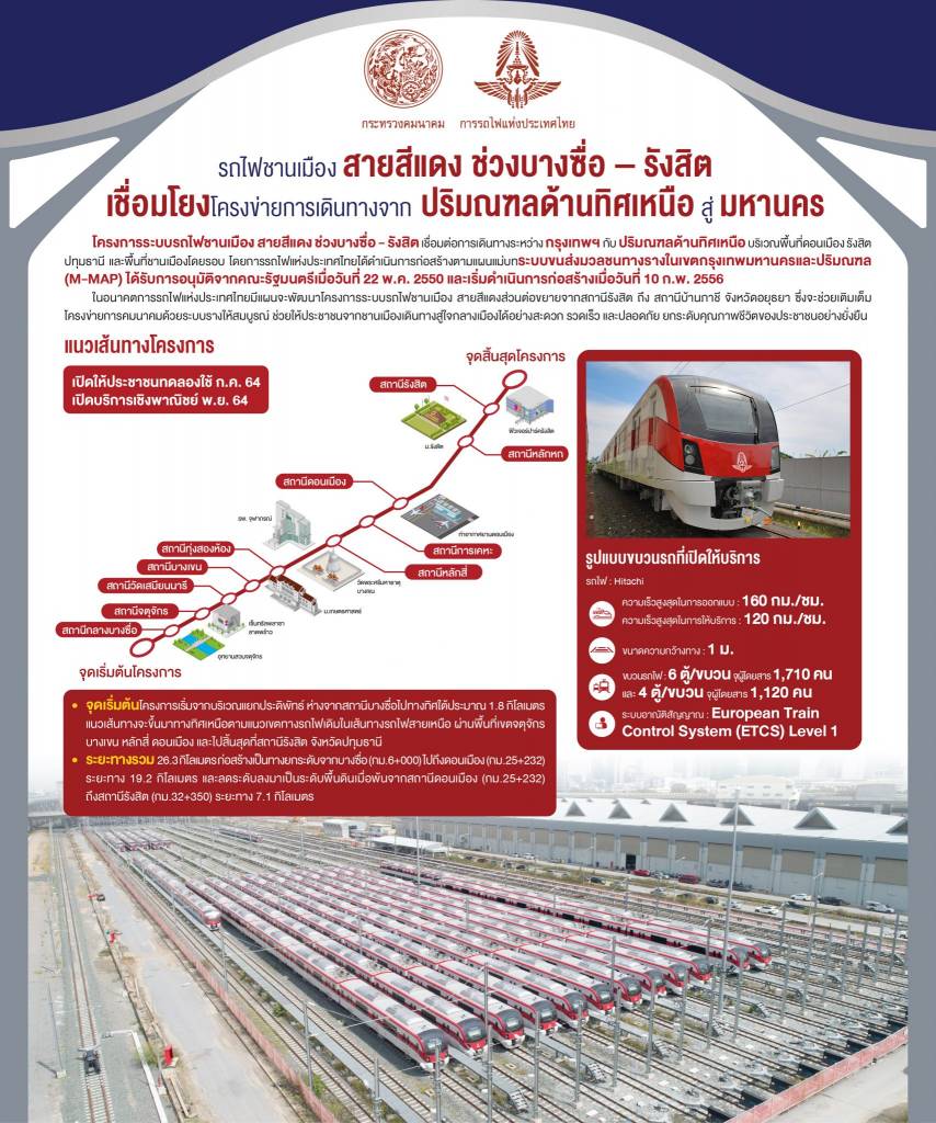 ด้านนายนิรุฒ มณีพันธ์ ผู้ว่าการรถไฟแห่งประเทศไทย กล่าวว่า ปัจจุบันงานก่อสร้างสถานีกลางบางซื่อ ศูนย์ซ่อมบำรุงรถไฟชานเมือง และงานก่อสถานีรถไฟสายสีแดง ช่วง บางซื่อ-รังสิต และบางซื่อ-ตลิ่งชัน จำนวน 13 สถานี และงานก่อสร้างถนนเลียบทางรถไฟ ดำเนินการก่อสร้างงานโยธาแล้วเสร็จ คงเหลืองานระบบไฟฟ้าและเครื่องกล รวมจัดหาตู้รถไฟฟ้าสำหรับช่วงบางซื่อ-รังสิต และบางซื่อ-ตลิ่งชัน ประกอบด้วย งานระบบราง ระบบควบคุมการเดินรถ และระบบอาณัติสัญญาณ ระบบโทรคมนาคม ระบบจำหน่ายตั๋วโดยสาร อุปกรณ์สำหรับศูนย์ซ่อมบำรุง ระบบรักษาความปลอดภัย สถานีไฟฟ้าย่อยและหม้อแปลงไฟฟ้าและระบบขับเคลื่อนรถไฟฟ้า และระบบอื่นๆ งานจัดหาตู้รถไฟฟ้ารวมถึงการจัดเตรียมอบรมบุคลากรในการบริหารและซ่อมบำรุงระบบรถไฟฟ้า
