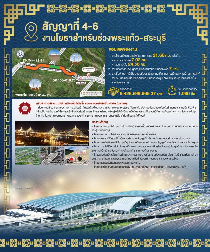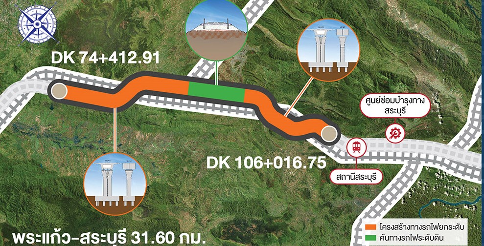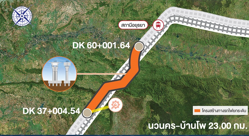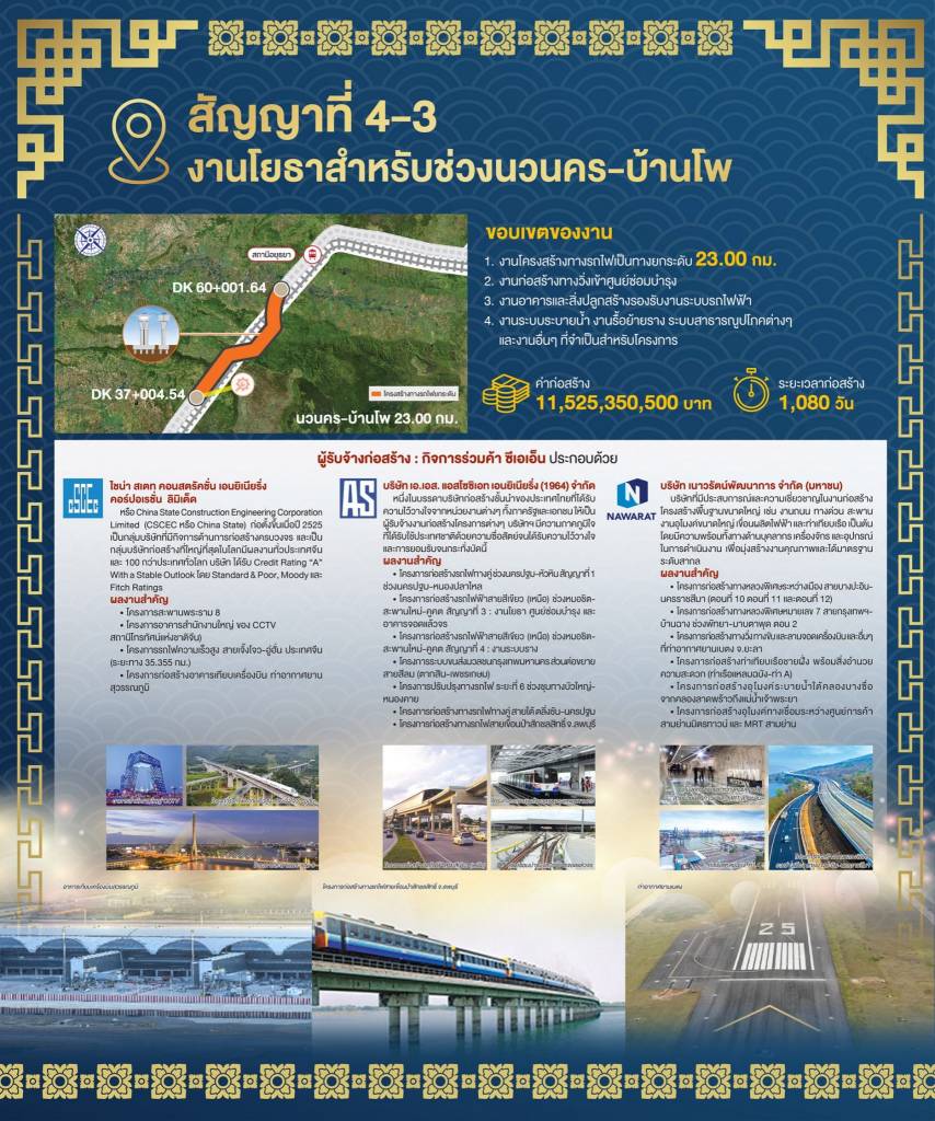 ด้านนายนิรุฒ มณีพันธ์ ผู้ว่าการรถไฟแห่งประเทศไทย เปิดเผยว่า สำหรับสัญญาที่ 4-3 งานโยธาสำหรับช่วงนวนคร-บ้านโพ ประกอบด้วย งานโครงสร้างทางรถไฟเป็นทางยกระดับ 23 กม. งานก่อสร้างทางวิ่งเข้าศูนย์ซ่อมบำรุง งานอาคาร และสิ่งปลูกสร้างรองรับงานระบบรถไฟฟ้า งานระบบระบายน้ำ งานรื้อย้ายรางและระบบสาธารณูปโภคต่างๆ สัญญาที่ 4-4 งานโยธาสำหรับศูนย์ซ่อมบำรุงเชียงรากน้อย ประกอบด้วย ทางรถไฟระดับพื้นในศูนย์ซ่อมบำรุง งานอาคารภายในศูนย์ซ่อมบำรุงรวมถนนต่อเชื่อม ได้แก่ อาคารระบบซ่อมบำรุงขบวนรถไฟ 19 อาคาร อาคารควบคุมระบบการจัดการเดินรถและฝึกอบรม 4 อาคาร อาคารสำหรับระบบซ่อมบำรุงทาง 8 อาคาร งานก่อสร้างถนนงานระบบระบายน้ำและงานรื้อย้ายระบบสาธารณูปโภคต่างๆ สัญญาที่ 4-6 งานโยธาสำหรับช่วงพระแก้ว-สระบุรี ประกอบด้วย งานโครงสร้างทางรถไฟ ระยะทางรวม 31.60 กม. แบ่งเป็น คันทางระดับดิน 7.02 กม. และทางยกระดับ 24.58 กม. งานอาคารและสิ่งปลูกสร้างรองรับงานระบบรถไฟฟ้า 7 แห่ง รวมทั้งงานรื้อย้ายสถานีเดิม งานปรับปรุงย้ายถนนเดิม งานก่อสร้าง สะพานข้ามทางรถไฟ งานระบบระบายน้ำ และงานรื้อย้ายระบบสาธารณูปโภคต่างๆ