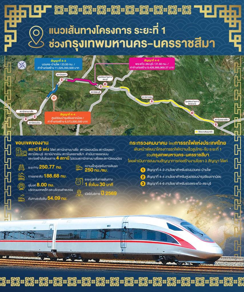 นายศักดิ์สยาม ชิดชอบ รัฐมนตรีว่าการกระทรวงคมนาคม กล่าวว่า พิธีลงนามสัญญาการก่อสร้างโครงการความร่วมมือระหว่างรัฐบาลแห่งราชอาณาจักรไทย และรัฐบาลแห่งสาธารณรัฐประชาชนจีน ในการพัฒนาระบบรถไฟความเร็วสูงเพื่อเชื่อมโยงภูมิภาค ช่วงกรุงเทพมหานคร - หนองคาย (ระยะที่ 1 ช่วงกรุงเทพมหานคร - นครราชสีมา) จำนวน 3 สัญญา ในวันนี้ เป็นโครงการที่สำคัญอย่างยิ่ง เนื่องจากเป็นเส้นทางยุทธศาสตร์สำคัญในการเชื่อมไทยสู่โลก และเป็นโครงการความร่วมมือระหว่างรัฐบาลทั้งสองประเทศ เป็นการเชื่อมความสัมพันธ์ให้แน่นแฟ้นยิ่งขึ้น ซึ่งรัฐบาลได้ให้ความสนใจและเร่งรัด ติดตามความก้าวหน้าของโครงการมาโดยตลอด และในขณะเดียวกัน เส้นทางนี้ก็จะเป็นเส้นทางยุทธศาสตร์ในการเชื่อมไทยไปสู่ สปป.ลาว และจีน โดยเป็นส่วนหนึ่งของเส้นทางสายไหมแห่งศตวรรษที่ 21 ที่เรียกว่า Belt and Road Initiative หรือ BRI ที่จะเชื่อมภูมิภาคเอเชียตะวันออกเฉียงใต้ไปถึงยุโรปได้ด้วยทางรถไฟ โดยกระทรวงคมนาคมพยายามเร่งรัดโครงการให้เดินหน้าโดยเร็ว ล่าสุด ก็ได้มีการลงนามในสัญญาจ้างงานระบบราง ระบบไฟฟ้าและเครื่องกล รวมทั้งจัดหาขบวนรถไฟและจัดฝึกอบรมบุคลากร (สัญญา 2.3) ของโครงการความร่วมมือระหว่างรัฐบาลแห่งราชอาณาจักรไทยและรัฐบาลแห่งสาธารณรัฐประชาชนจีน ในการพัฒนาระบบรถไฟความเร็วสูงเพื่อเชื่อมโยงภูมิภาคช่วงกรุงเทพมหานคร – หนองคาย (ระยะที่ 1 ช่วงกรุงเทพมหานคร – นครราชสีมา) ไปเมื่อวันที่ 28 ตุลาคม 2563 ที่ผ่านมา ส่วนวันนี้เป็นการลงนามในสัญญาก่อสร้างเพิ่มเติม 3 สัญญา ประกอบด้วย สัญญาที่ 4-3 งานโยธาสำหรับช่วงนวนคร-บ้านโพ วงเงินก่อสร้าง 11,525,350,500 บาท สัญญาที่ 4-4 งานโยธาสำหรับศูนย์ซ่อมบำรุงเชียงรากน้อย วงเงินก่อสร้าง 6,573,000,000 บาท และสัญญาที่ 4-6 งานโยธาสำหรับช่วงพระแก้ว-สระบุรี วงเงินก่อสร้าง 9,428,999,969.37 บาท มีระยะเวลาก่อสร้างแต่ละสัญญา 1,080 วัน รวมวงเงินก่อสร้างทั้ง 3 สัญญา 27,527,350,469.37 ล้านบาท