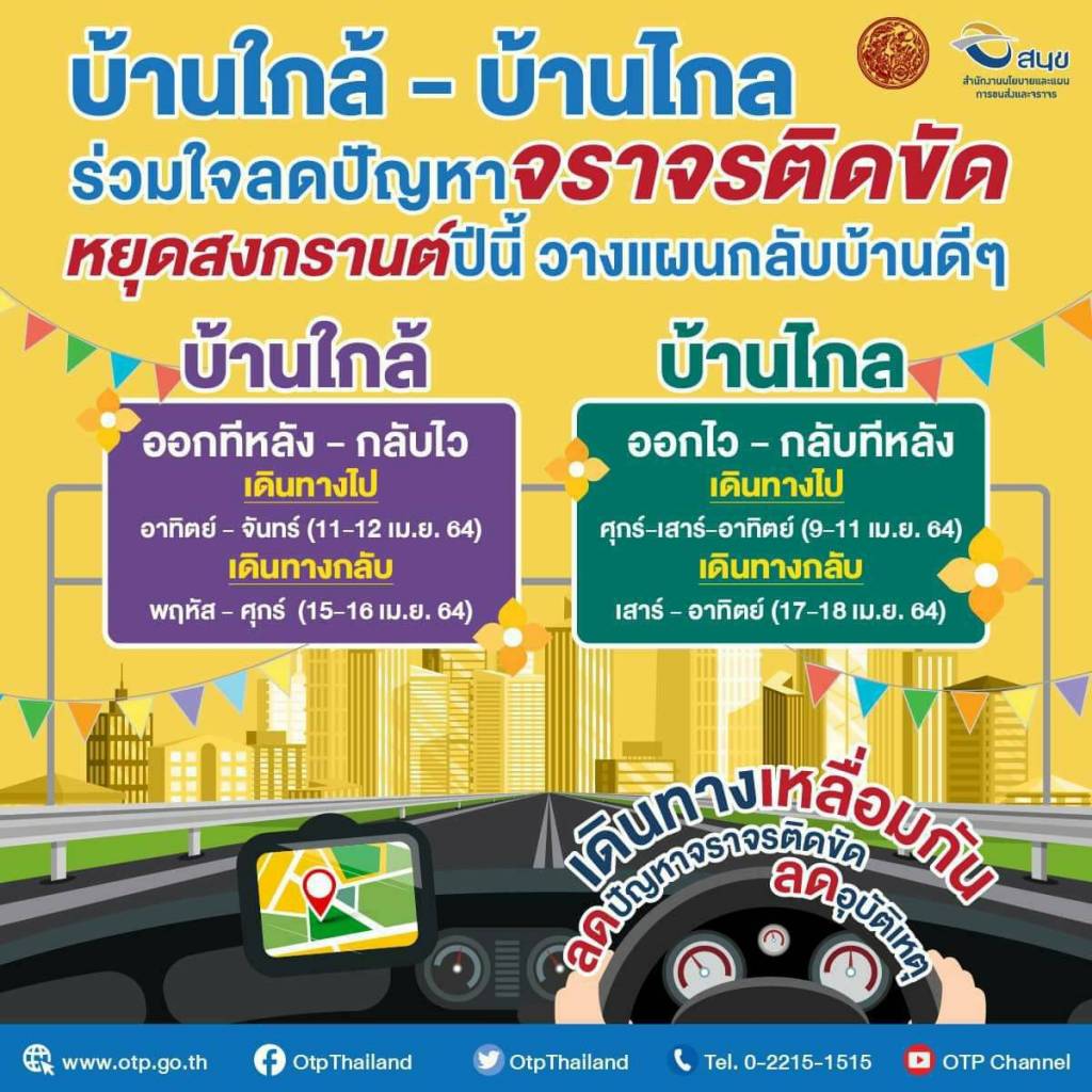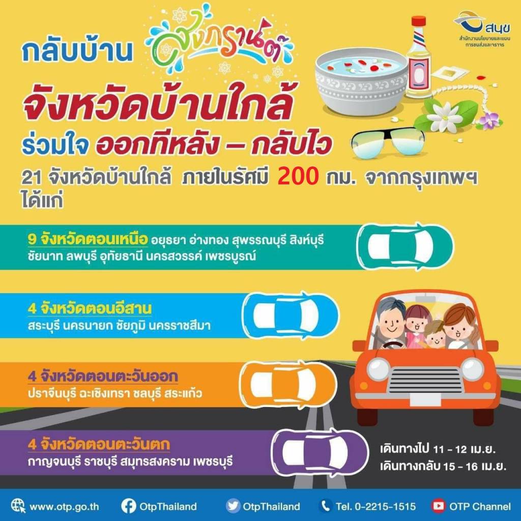 สำนักงานนโยบายและแผนการขนส่งและจราจร (สนข.) ได้ดำเนินการวิเคราะห์ข้อมูลการเดินทาง เพื่อคาดการณ์แนวโน้มปริมาณจราจรในการเดินทางของพี่น้องประชาชนช่วงเทศกาลสงกรานต์ 2564 ทั้งในช่วงที่เดินทางออกจากกรุงเทพมหานคร และช่วงที่เดินทางกลับเข้ากรุงเทพมหานคร พบว่า มีปริมาณจราจร ในการเดินทางออกจากกรุงเทพฯ สูงถึง 946,133 คันต่อวัน ในช่วงที่มีการเดินทางสูงสุด และมีปริมาณจราจรในการเดินทางกลับเข้ากรุงเทพฯ สูงถึง 667,040 คันต่อวัน ในช่วงที่มีการเดินทางสูงสุด ดังนั้น เพื่อเป็นการกระจายปริมาณจราจรบนถนน และบรรเทาปัญหาการจราจรติดขัด สนข. จึงขอความร่วมมือพี่น้องประชาชนวางแผนการเดินทางล่วงหน้าภายใต้มาตรการ “บ้านใกล้เดินทางออกทีหลัง และเดินทางกลับก่อน” เพื่อกระจายการเดินทาง และเหลื่อมเวลาการเดินทางในเส้นทางเข้า – ออกกรุงเทพมหานคร โดยขอความร่วมมือพี่น้องประชาชนที่จะเดินทาง กลับภูมิลำเนา หรือท่องเที่ยวภายในรัศมี 200 กิโลเมตร จากกรุงเทพมหานคร เดินทางออกช่วงระหว่างวันอาทิตย์ที่ 11 หรือวันจันทร์ที่ 12 เมษายน 2564 และเดินทางกลับช่วงระหว่างวันพฤหัสบดีที่ 15 หรือวันศุกร์ที่ 16 เมษายน 2564 โดยสามารถแบ่งเป็นกลุ่มจังหวัดบ้านใกล้ที่จะขอความร่วมมือจำนวน 21 จังหวัด ได้แก่