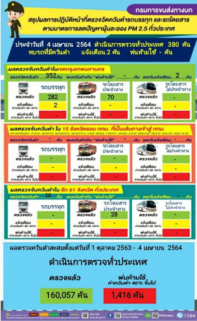 ทั้งนี้ กำชับผู้ประกอบการและเจ้าของรถทุกคันที่ถูกพ่นห้ามใช้ ต้องนำรถไปแก้ไขและนำรถเข้ารับการตรวจสภาพ ณ สำนักงานขนส่ง หากฝ่าฝืนใช้รถโดยที่มีคำสั่งห้ามใช้ มีความผิดตามกฎหมาย ด้านประชาชนสามารถมีส่วนร่วมป้องกันและแก้ไขปัญหาฝุ่นละอองขนาดเล็ก PM2.5 ด้วยการส่งภาพรถบรรทุกและรถโดยสารควันดำที่สังเกตเห็นหมายเลขทะเบียนชัดเจน ให้ศูนย์คุ้มครองผู้โดยสารและรับเรื่องร้องเรียน สายด่วน 1584 ตลอด 24 ชั่วโมง •Line@: @1584DLT •Facebook: 1584 ร้องเรียนรถโดยสารสาธารณะ https://www.facebook.com/dlt1584/ •เว็บไซต์ http://ins.dlt.go.th/cmpweb/ •แอปพลิเคชัน DLT GPS •E-mail: dlt_1584complain@hotmail.com