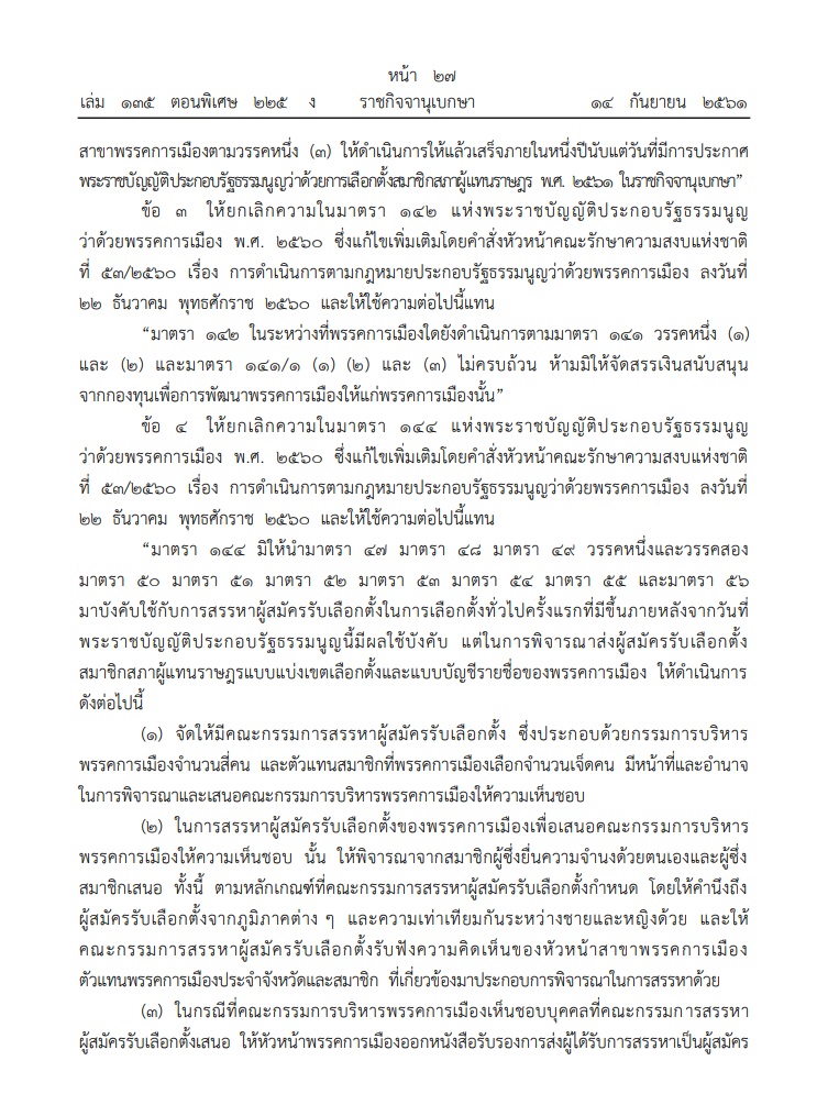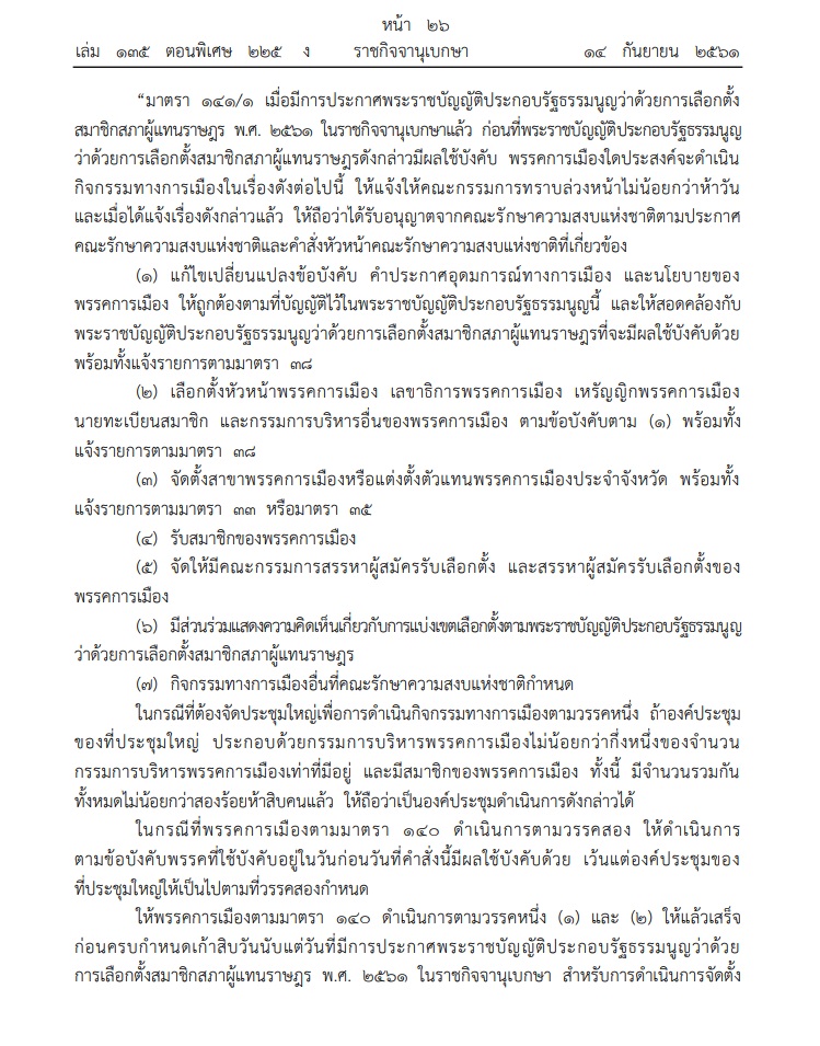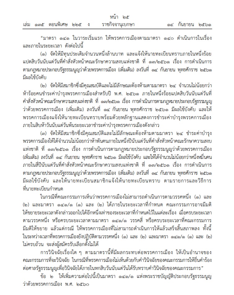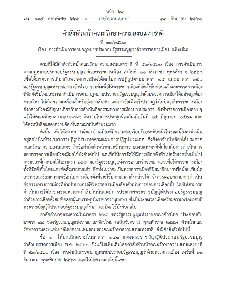 วันนี้ (๑๔ กันยายน) ผู้สื่อข่าวรายงานว่า ราชกิจจานุเบกษา เผยแพร่คำสั่งหัวหน้าคณะรักษาความสงบแห่งชาติที่ 13 /๒๕๖๑ เรื่อง การดำเนินการตามกฎหมายประกอบรัฐธรรมนูญว่าด้วยพรรคการเมือง (เพิ่มเติม) มีรายละเอียดสำคัญเช่น ให้สามารถดำเนินธุรการของพรรคการเมืองต่างๆ สามารถสรรหาสมาชิกพรรค สรรหาผู้สมัคร จัดการระดมทุนของพรรค