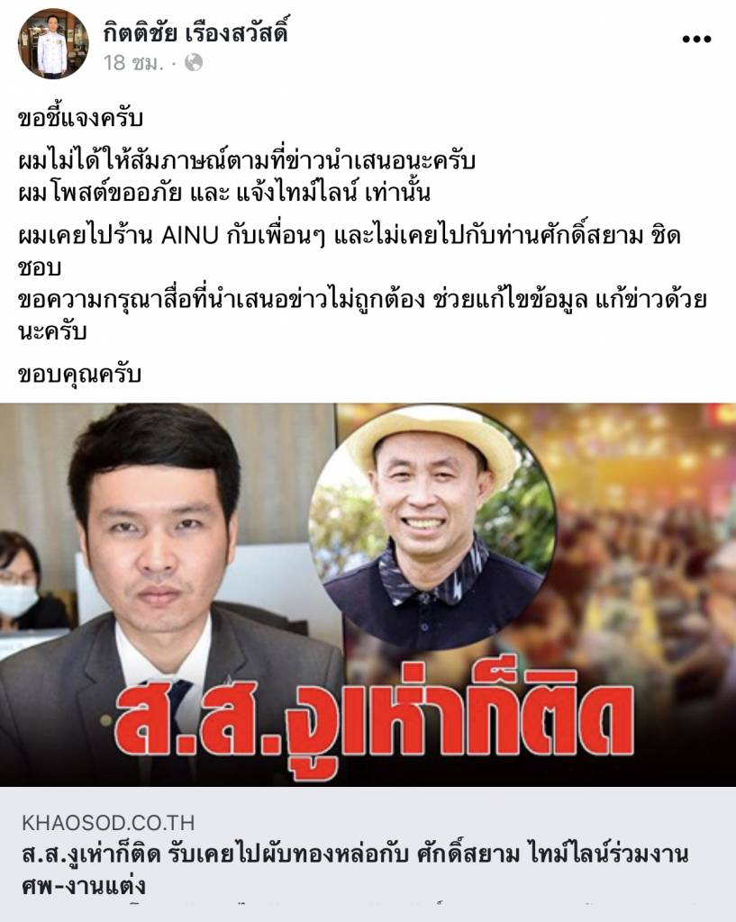 “ขอชี้แจงครับ ผมไม่ได้ให้สัมภาษณ์ตามที่ข่าวนำเสนอนะครับ ผมโพสต์ขออภัย และ แจ้งไทม์ไลน์ เท่านั้น ผมเคยไปร้าน AINU กับเพื่อนๆ และไม่เคยไปกับท่านศักดิ์สยาม ชิดชอบ ขอความกรุณาสื่อที่นำเสนอข่าวไม่ถูกต้อง ช่วยแก้ไขข้อมูล แก้ข่าวด้วยนะครับ ขอบคุณครับ”