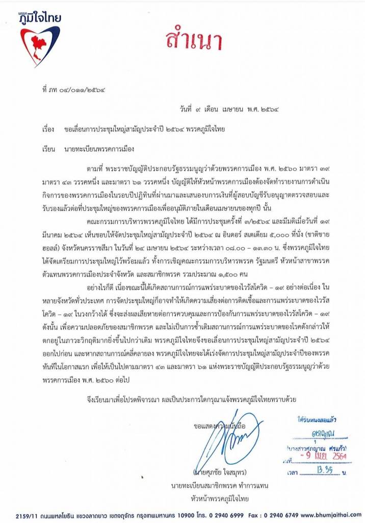 อย่างไรก็ดีเนื่องด้วยขณะนี้เกิดสถานการณ์การแพร่ระบาดของไวรัสโควิด - 19 อย่างต่อเนื่องในหลายนจังหวัดทั่วประเทศ การจัดประชุมใหญ่ก็อาจทำให้เกิดความเสี่ยงต่อการติดเชื้อและการแพร่ระบาดของไวรัสโควิด-19 ในวงกว้างได้ ซึ่งจะส่งผลเสียหายต่อการควบคุมและการป้องกันการแพร่ระบดของไวรัสโควิด - 19 ดังนั้น เพื่อความปลอดภัยของสมาชิกพรรค และไม่เป็นการซ้ำเติมสถานการณ์การแพร่ระบาดของโรคดังกล่าว ให้ตกอยู่ในภาวะวิกฤติมากยิ่งขึ้นไปกว่าเดิม พรรคภูมิใจไทยจึงขอเลื่อนการประชุมใหญ่สามัญประจำปี 2564 ออกไปก่อน และหากสถานการณ์คลี่คลายลง พรรคภูมิใจไทย จะได้เร่งจัดการประชุมใหญ่สามัญประจำปีของพรรคทันทีในโอกาสแรก เพื่อเป็นไปตาม มาตรา 39 มาตรา 43 และมาตรา 61 แห่ง พระราชบัญญัติประกอบรัฐธรรมนูญว่าด้วยพรรคการเมือง พ.ศ.2560 ต่อไป
