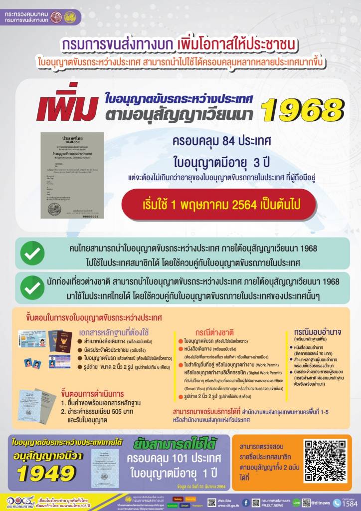 กรมการขนส่งทางบก เตรียมพร้อม!!! 1 พฤษภาคม 2564 เป็นต้นไป สามารถออกใบอนุญาตขับรถระหว่างประเทศภายใต้อนุสัญญาเวียนนา 1968 ไปใช้ครอบคลุมหลากหลายประเทศมากขึ้น และเป็นการเตรียมความพร้อมของประเทศไทยเพื่อรองรับนักท่องเที่ยวต่างชาติหลังโควิด-19 คลี่คลาย