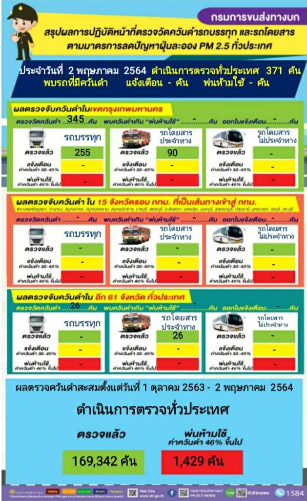 วันนี้ (2 พฤษภาคม 2564) นายจิรุตม์ วิศาลจิตร อธิบดีกรมการขนส่งทางบก เผยผลการดำเนินการตรวจควันดำรถบรรทุกและรถโดยสารทั่วประเทศ ซึ่งเป็นการดำเนินการต่อเนื่อง ตามนโยบายของนายศักดิ์สยาม ชิดชอบ รัฐมนตรีว่าการกระทรวงคมนาคม เพื่อป้องกันและแก้ไขปัญหาฝุ่นละอองขนาดเล็ก PM2.5 เฉพาะวันที่ 2 พฤษภาคม 2564ดำเนินการตรวจวัดควันดำรถโดยสารและรถบรรทุกทั่วประเทศ จำนวน 371 คัน ไม่พบรถที่มีค่าควันดำเกินเกณฑ์มาตรฐานที่ราชการกำหนด ส่งผลให้ตั้งแต่วันที่ 1 ตุลาคม – 2 พฤษภาคม 2564 ดำเนินการตรวจควันดำรถทั้งสิ้น 169,342 คัน พ่นห้ามใช้แล้วจำนวน 1,429 คัน ทั้งนี้ กำชับผู้ประกอบการและเจ้าของรถทุกคันที่ถูกพ่นห้ามใช้ ต้องนำรถไปแก้ไขและนำรถเข้ารับการตรวจสภาพ ณ สำนักงานขนส่ง หากฝ่าฝืนใช้รถโดยที่มีคำสั่งห้ามใช้ มีความผิดตามกฎหมาย ด้านประชาชนสามารถมีส่วนร่วมป้องกันและแก้ไขปัญหาฝุ่นละอองขนาดเล็ก PM2.5  ด้วยการส่งภาพรถบรรทุกและรถโดยสารควันดำที่สังเกตเห็นหมายเลขทะเบียนชัดเจน ให้ศูนย์คุ้มครองผู้โดยสารและรับเรื่องร้องเรียน สายด่วน 1584 ตลอด 24 ชั่วโมง •Line@: @1584DLT •Facebook: 1584 ร้องเรียนรถโดยสารสาธารณะ https://www.facebook.com/dlt1584/ •เว็บไซต์ http://ins.dlt.go.th/cmpweb/ •แอปพลิเคชัน DLT GPS •E-mail: dlt_1584complain@hotmail.com