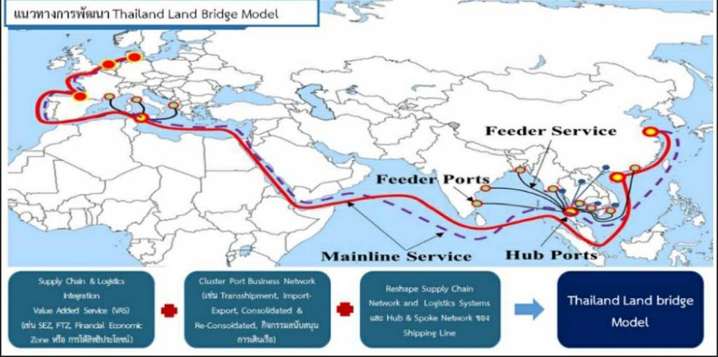 การขนส่งระหว่างอ่าวไทยและอันดามัน (Land bridge) โดยได้มีการกำหนดกลยุทธ์ในการศึกษาแนวทางการพัฒนาของโครงการออกเป็น 4 ด้าน ประกอบด้วย