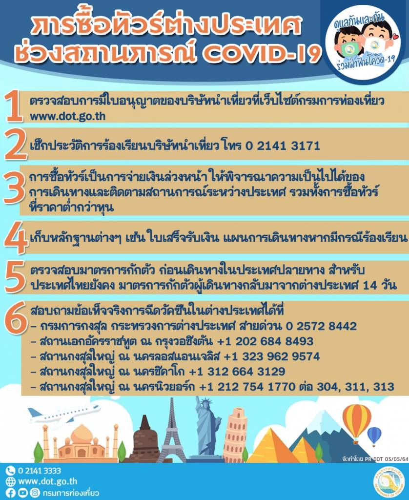 “ผู้ที่จะทำทัวร์ในลักษณะนี้ต้องปฏิบัติตามพระราชบัญญัติธุรกิจนำเที่ยวและมัคคุเทศก์ พ.ศ.2551 และที่แก้ไขเพิ่มเติม (ฉบับที่ 2) พ.ศ.2559 นอกจากนี้ บริษัทนำเที่ยวควรต้องศึกษารายละเอียดเกี่ยวกับมาตรการต่างๆ ของประเทศปลายทาง ในการเดินทางเข้าประเทศช่วงสถานการณ์การแพร่ระบาดของเชื้อไวรัสโควิด-19 เช่น ข้อปฏิบัติเกี่ยวกับการกักตัว ข้อจำกัดในการเดินทางท่องเที่ยว เงื่อนไขเข้ารับการฉีดวัคซีนของประเทศนั้นๆ รวมถึงผลกระทบที่อาจเกิดขึ้นภายหลังการฉีดวัคซีน” อธิบดีกรมการท่องเที่ยวกล่าวทิ้งท้าย