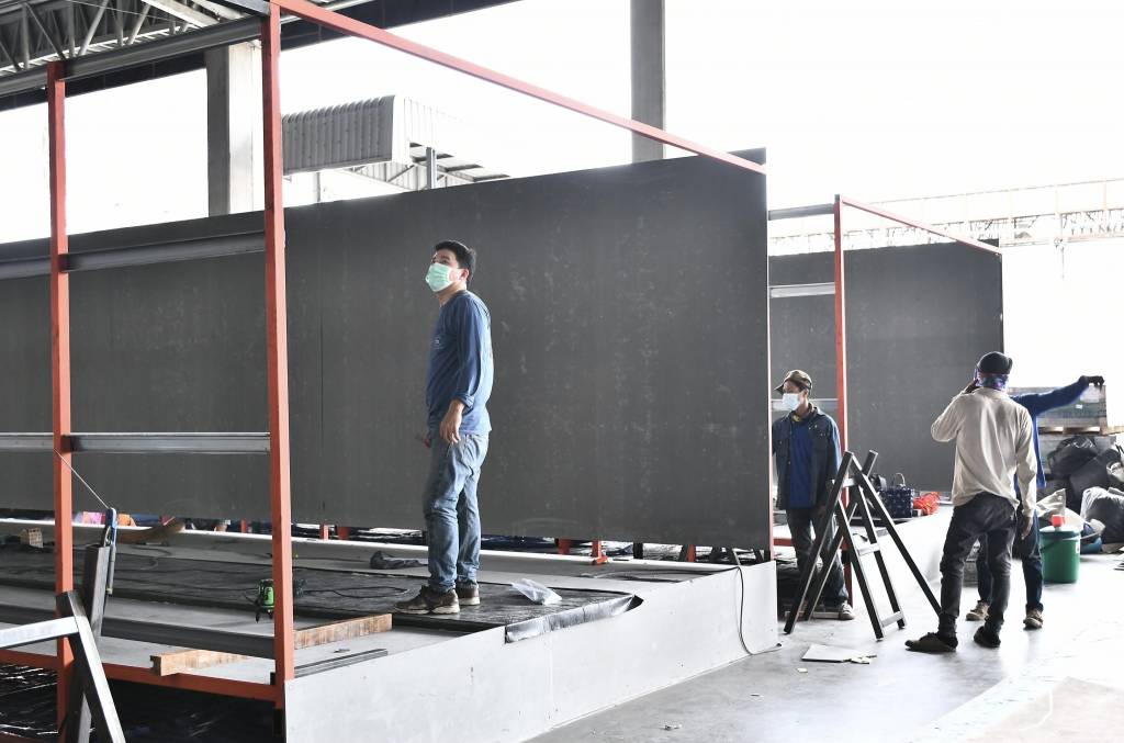 ขณะนี้ได้วางเตียง เครื่องนอน พร้อมติดตั้งท่อช่วยหายใจไว้บริเวณหัวเตียงสำหรับรองรับผู้ติดเชื้อสีเหลืองที่จำเป็นต้องใช้เครื่องช่วยหายใจเป็นที่เรียบร้อยแล้ว รวมทั้งได้ก่อสร้างห้องอาบน้ำสำหรับผู้ติดเชื้อจำนวน 364 ห้องแยกโซนหญิง-ชาย โดยได้รับการสนับสนุนจากภาคเอกชนในประเทศ ทั้งบริษัทก่อสร้าง-อสังหาริมทรัพย์ บริษัทผลิตเครื่องนอน และโรงงานกระดาษที่ช่วยผลิตเตียงนอน