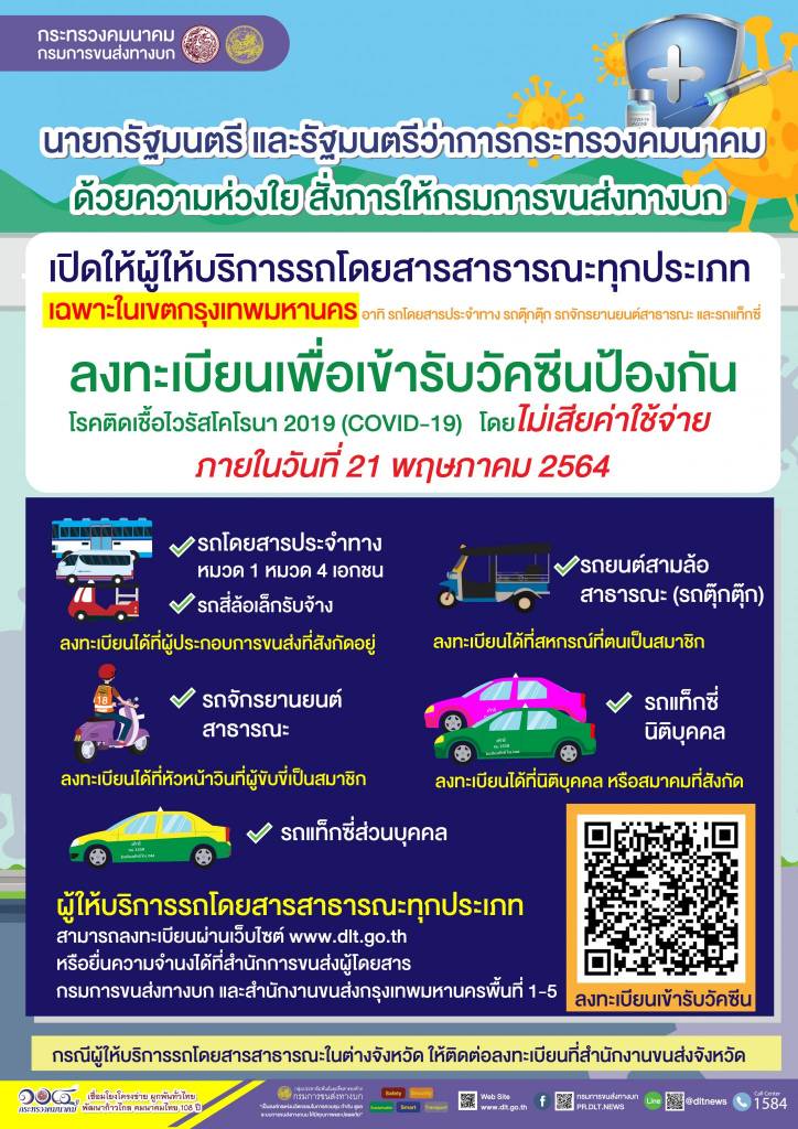 กรมการขนส่งทางบก ขานรับนโยบายนายกรัฐมนตรีและรัฐมนตรีว่าการกระทรวงคมนาคม เปิดให้รถโดยสารสาธารณะทุกประเภทในเขตกรุงเทพฯ อาทิ รถโดยสารประจำทาง รถตุ๊กตุ๊ก รถจักรยานยนต์สาธารณะและรถแท็กซี่ ลงทะเบียนเพื่อเข้ารับวัคซีนโควิด-19 โดยไม่เสียค่าใช้จ่าย สำหรับผู้ให้บริการรถโดยสารสาธารณะต่างจังหวัดลงทะเบียนได้ที่สำนักงานขนส่งจังหวัด