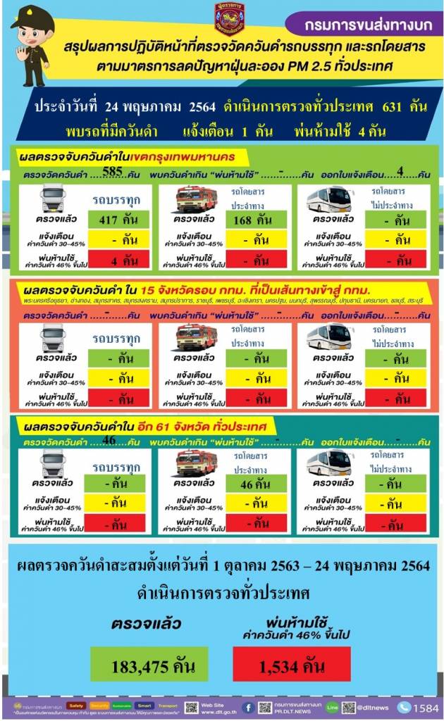 วันนี้ (24 พฤษภาคม 2564) นายจิรุตม์ วิศาลจิตร อธิบดีกรมการขนส่งทางบก เผยผลการดำเนินการตรวจควันดำรถบรรทุกและรถโดยสารทั่วประเทศ ซึ่งเป็นการดำเนินการต่อเนื่อง ตามนโยบายของนายศักดิ์สยาม ชิดชอบ รัฐมนตรีว่าการกระทรวงคมนาคม เพื่อป้องกันและแก้ไขปัญหาฝุ่นละอองขนาดเล็ก PM2.5 เฉพาะวันที่ 24 พฤษภาคม 2564 ดำเนินการตรวจวัดควันดำรถโดยสารและรถบรรทุกทั่วประเทศ จำนวน 631 คัน พบรถที่มีค่าควันดำเกินเกณฑ์มาตรฐานที่ราชการกำหนด จำนวน 4 คัน  ในขณะที่พบรถที่มีค่าควันดำ 30 - 45 % ได้ออกใบเตือนเพื่อให้ผู้ประกอบการไปบำรุงดูแลรักษารถไม่ให้มีค่าควันดำเกิน จำนวน 1 คัน ส่งผลให้ตั้งแต่วันที่ 1 ตุลาคม – 24 พฤษภาคม 2564 ดำเนินการตรวจควันดำรถทั้งสิ้น 183,475 คัน พ่นห้ามใช้แล้วจำนวน 1,534 คัน ทั้งนี้ กำชับผู้ประกอบการและเจ้าของรถทุกคันที่ถูกพ่นห้ามใช้ ต้องนำรถไปแก้ไขและนำรถเข้ารับการตรวจสภาพ ณ สำนักงานขนส่ง หากฝ่าฝืนใช้รถโดยที่มีคำสั่งห้ามใช้ มีความผิดตามกฎหมาย ด้านประชาชนสามารถมีส่วนร่วมป้องกันและแก้ไขปัญหาฝุ่นละอองขนาดเล็ก PM2.5  ด้วยการส่งภาพรถบรรทุกและรถโดยสารควันดำที่สังเกตเห็นหมายเลขทะเบียนชัดเจน ให้ศูนย์คุ้มครองผู้โดยสารและรับเรื่องร้องเรียน สายด่วน 1584 ตลอด 24 ชั่วโมง •Line@: @1584DLT •Facebook: 1584 ร้องเรียนรถโดยสารสาธารณะ https://www.facebook.com/dlt1584/ •เว็บไซต์ http://ins.dlt.go.th/cmpweb/ •แอปพลิเคชัน DLT GPS •E-mail: dlt_1584complain@hotmail.com