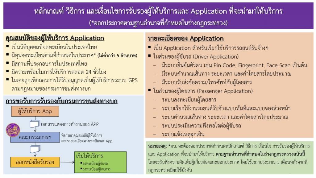 สำหรับร่างกฎกระทรวงว่าด้วยรถยนต์รับจ้างบรรทุกคนโดยสารไม่เกิน 7 คน ผ่านระบบอิเล็กทรอนิกส์ มีรายละเอียดที่สำคัญเช่น การกำหนดนิยาม “รถยนต์รับจ้างผ่านระบบอิเล็กทรอนิกส์” หมายความว่า รถยนต์รับจ้างที่เกิดจากการนำรถยนต์นั่งส่วนบุคคลมาจดทะเบียนเปลี่ยนประเภทเป็นรถยนต์รับจ้าง โดยการรับจ้างผ่านระบบอิเล็กทรอนิกส์ และ กำหนดให้รถยนต์รับจ้างที่จะนำมาจดทะเบียนแบ่งเป็น 3 ประเภทคือ ขนาดเล็ก กลาง และใหญ่ โดยให้จดทะเบียนได้คนละ 1 คัน ส่วนลักษณะของรถยนต์รับจ้างที่จะนำมาจดทะเบียนต้องมีลักษณะเป็น รถเก๋งสองตอน รถเก๋งสองตอนแวน รถเก๋งสามตอน รถเก๋งสามตอนแวน รถยนต์นั่งสองตอน รถยนต์นั่งสองตอนแวน รถยนต์นั่งสามตอน รถยนต์นั่งสามตอนแวน หรือรถยนต์ลักษณะอื่นตามที่อธิบดีประกาศกำหนดโดยความเห็นชอบของรัฐมนตรี
