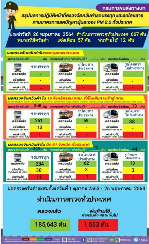 วันนี้ (26 พฤษภาคม 2564) นายจิรุตม์ วิศาลจิตร อธิบดีกรมการขนส่งทางบก เผยผลการดำเนินการตรวจควันดำรถบรรทุกและรถโดยสารทั่วประเทศ ซึ่งเป็นการดำเนินการต่อเนื่อง ตามนโยบายของนายศักดิ์สยาม ชิดชอบ รัฐมนตรีว่าการกระทรวงคมนาคม เพื่อป้องกันและแก้ไขปัญหาฝุ่นละอองขนาดเล็ก PM2.5 เฉพาะวันที่ 26 พฤษภาคม 2564 ดำเนินการตรวจวัดควันดำรถโดยสารและรถบรรทุกทั่วประเทศ จำนวน 667 คัน พบรถที่มีค่าควันดำเกินเกณฑ์มาตรฐานที่ราชการกำหนด จำนวน 12 คัน  ในขณะที่พบรถที่มีค่าควันดำ 30 - 45 % ได้ออกใบเตือนเพื่อให้ผู้ประกอบการไปบำรุงดูแลรักษารถไม่ให้มีค่าควันดำเกิน จำนวน 57 คัน ส่งผลให้ตั้งแต่วันที่ 1 ตุลาคม – 26 พฤษภาคม 2564 ดำเนินการตรวจควันดำรถทั้งสิ้น 185,643 คัน พ่นห้ามใช้แล้วจำนวน 1,563 คัน ทั้งนี้ กำชับผู้ประกอบการและเจ้าของรถทุกคันที่ถูกพ่นห้ามใช้ ต้องนำรถไปแก้ไขและนำรถเข้ารับการตรวจสภาพ ณ สำนักงานขนส่ง หากฝ่าฝืนใช้รถโดยที่มีคำสั่งห้ามใช้ มีความผิดตามกฎหมาย ด้านประชาชนสามารถมีส่วนร่วมป้องกันและแก้ไขปัญหาฝุ่นละอองขนาดเล็ก PM2.5  ด้วยการส่งภาพรถบรรทุกและรถโดยสารควันดำที่สังเกตเห็นหมายเลขทะเบียนชัดเจน ให้ศูนย์คุ้มครองผู้โดยสารและรับเรื่องร้องเรียน สายด่วน 1584 ตลอด 24 ชั่วโมง •Line@: @1584DLT •Facebook: 1584 ร้องเรียนรถโดยสารสาธารณะ https://www.facebook.com/dlt1584/ •เว็บไซต์ http://ins.dlt.go.th/cmpweb/ •แอปพลิเคชัน DLT GPS •E-mail: dlt_1584complain@hotmail.com