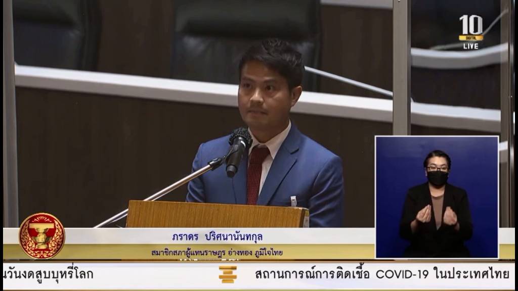 นายภราดร ปริศนานันทกุล สมาชิกสภาผู้แทนราษฎร จังหวัดอ่างทอง พรรคภูมิใจไทย อภิปรายงบประมาณประจำปี 2565 ว่า ช่วงนี้ประเทศไทยอยู่ในสถานการณ์ที่ไม่ปกติ ช่วงตลอดระยะเวลา 1 ปีที่ผ่านมาตั้งแต่ปีที่แล้ว จนถึงปีนี้ 2564 เชื่อว่าจะต่อเนื่องออกไปอีกอย่างน้อยจนกระทั่งถึงสิ้นปีนี้ สถานการณ์ของประเทศไทยอยู่ในสถานการณ์ที่ไม่ปกติอย่างรุนแรง จึงไม่แปลกใจที่วันนี้การตั้งงบประมาณประจำปีของทางสำนักงบประมาณ ที่ได้เสนอต่อคณะรัฐมนตรีจึงได้ถูกปรับลดงบประมาณจากปีที่แล้วลง ลดลงเหลือ 3.1 ล้านล้านบาท ในปีนี้ หมายความว่าเงินงบประมาณในการที่จะไปพัฒนาประเทศหายไปถึง 2 แสนล้านบาท เหตุที่เป็นเช่นนั้นเพราะว่าการจัดเก็บรายได้ของประเทศไทยลดต่ำลงตามสภาวะ Covid-19 ที่กำลังเกิดขึ้น และที่กำลังเผชิญอยู่นี้ ตัวเลขคาดการณ์การจัดเก็บในปีนี้ลดลงถึง 10 % จากเมื่อปีที่แล้ว ปีที่แล้วจัดเก็บอยู่ที่ 2.67 ล้านล้านบาท ในขณะที่ปีนี้คาดการณ์ว่าเหลือเพียงแค่ 2.4 ล้านล้านบาท นั่นคือ 10 % ที่ลดลง
