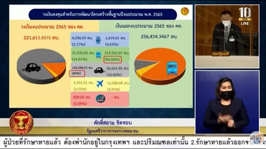 1.งบประมาณโครงสร้างการลงทุน เป็นงบประมาณโครงสร้างพื้นฐานปีงบประมาณ 2565 มี 2 ส่วน ส่วนแรกเป็นงบประมาณปกติ มี วงเงินงบประมาณ 221,611ล้านบาท และ เงินนอกงบประมาณ 256,434 ล้านบาท โดยเงินนอกงบประมาณ จะแบ่งเป็น 1. การใช้ ตามพ.ร.บ.รัฐร่วมลงทุนกับเอกชน 2. การใช้งบเงินกู้ จากกระทรวงการคลัง 3.งบจากโครงสร้างพื้นฐาน ซึ่งงบประมาณที่ได้ดังกล่าวใช้ในการพัฒนาคมนาคม4 มิติ คือ 1.ระบบราง 240,000 ล้านบาท ซึ่งผูกพันไปอีก 3-4 ปี 2.ทางบก 190,000 ล้านบาท 3.ทางอากาศ 18,000 ล้านบาท 4.ทางน้ำ 6,000 ล้านบาท