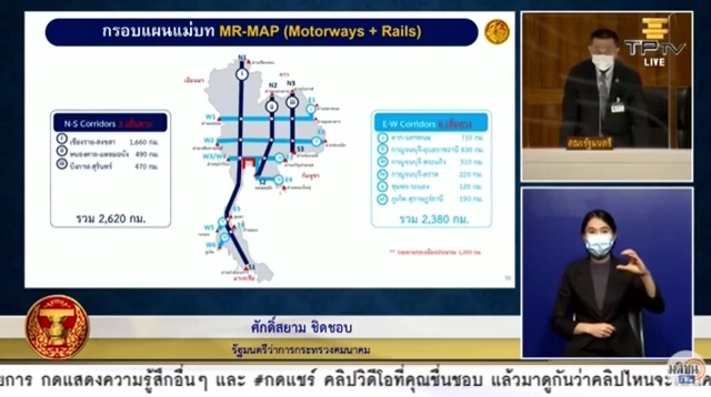 นอกจากนี้ นายกรัฐมนตรี ได้มอบนโยบายต่อกระทรวงคมนาคม ว่า หากมีการก่อสร้างขอให้พิจารณา Criteria ในการกำหนดแนวถนนตามข้อสั่งการ 5 เรื่อง ได้แก่ 1.ถนนแนวตรงทำให้การสัญจรสะดวก ลดปัญหาอุบัติเหตุ 2. ไม่ผ่านเข้าชุมชน ไม่ซ้ำแนวถนนเดิม 3. พัฒนาความเจริญเข้าสู่พื้นที่ใหม่ 4. สร้างชุมชนเมืองใหม่ 5 แยกการจราจรในเมืองใหม่ออกจากการเดินทางระหว่างเมือง กระทรวงคมนาคมจึงได้เนินการจัดทำ Master plan หรือเรียกว่า MR-MAP ซึ่งบูรณาการการก่อสร้าง รถไฟรางคู่ ร่วมก่อสร้างในพื้นที่แนวเดียวกับมอเตอร์เวย์ มี 9 เส้นทาง รวมระยะทาง 5,000 กม.ทั่วประเทศ แบ่งเป็น แนวเหนือใต้ (N-S) 3 เส้นทาง ระยะทาง 2,620 กม. ได้แก่ 1.เชียงราย-สงขลา 2.หนองคาย-แหลมฉบัง และ 3.บึงกาฬ-สุรินทร์ ขณะที่ แนวตะวันออก-ตะวันตก (E-W) 6. เส้นทาง ระยะทาง 2,380 กม. ได้แก่ 1.ตาก-นครพนม 2.กาญจนบุรี-อุบลราชธานี 3.กาญจนบุรี-สระแก้ว 4.กาญจนบุรี-ตราด 220 กม. 5.ชุมพร-ระนอง และ 6.ภูเก็ต-สุราษฎร์ธานี หากการดำเนินตามแผน MR-MAP แล้วเสร็จ จะก่อให้เกิดประโยชน์ทั้งในด้านเศรษฐกิจ สังคม และงบประมาณ ส่วนโครงการ Landbridge เป็นการขนส่งเชื่อมโยง 2 ฝั่งท่าเรือน้ำลึก ปัจจุบันโครงการอยู่ในขั้นตอน การคัดเลือกที่ตั้งของท่าเรือน้ำลึก ทั้งฝั่งอ่าวไทยและฝั่งอันดามัน ขาดภายใน 1 ปีจะทราบผลการศึกษา