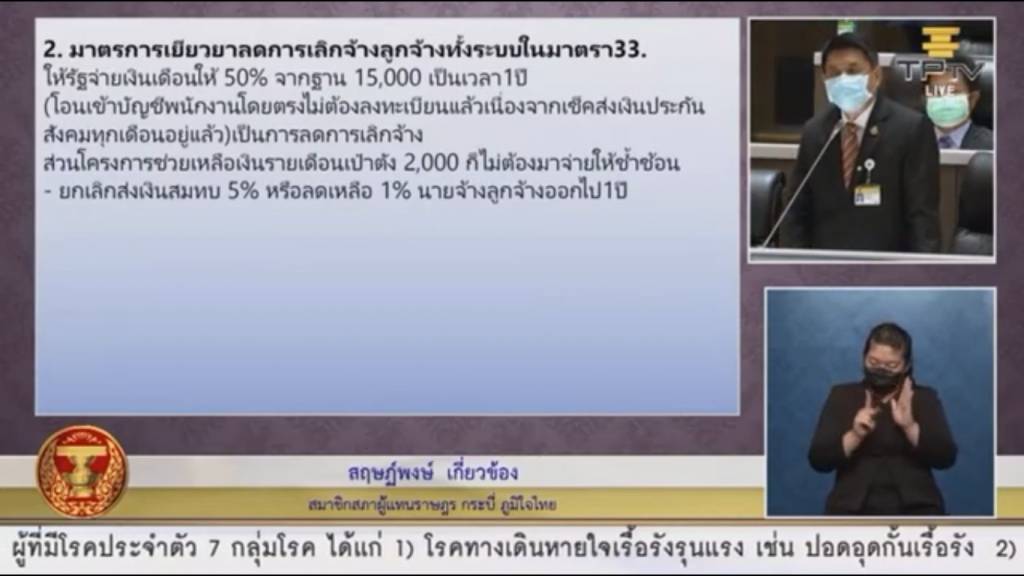 ในส่วนของเงินที่หักสมทบตามมาตรา 33 ก็เป็นปัญหา ที่จะให้นายจ้าง-ลูกจ้างจ่ายคนละครึ่ง จาก 5% บวก 5% ลดลงมาเหลืออยู่ 2.5 และลูกจ้าง 2.5 ตรงนี้ขอให้พักไว้ก่อนได้หรือไม่ และเงินในส่วนที่สมทบ เงินที่หักค่าลูกจ้างของโรงแรมต่างๆ ที่จริงแล้วมีเงินช่วยในส่วนของผู้ประกอบการธุรกิจโรงแรมได้หลายวิธีการด้วยกัน จึงขอฝากสภาพัฒน์ ซึ่งเป็นหน่วยงานหลักสำนักงบประมาณ และธนาคารแห่งประเทศไทยด้วย โดยเฉพาะกฤษฎีกาซึ่งเป็นผู้ที่หน่วยงานตีความทางกฏหมาย จะเห็นได้ว่า 4 องค์กรหลักเป็นหน่วยที่ชี้นำในส่วนของนโยบายขับเคลื่อนของรัฐบาล และมีความสำคัญอย่างยิ่ง และมีความผิดพลาดมาตลอด เพราะฉะนั้น รัฐบาล จะต้องวางกรอบที่ชัดเจนต้องแก้ไขปัญหาอย่างไร