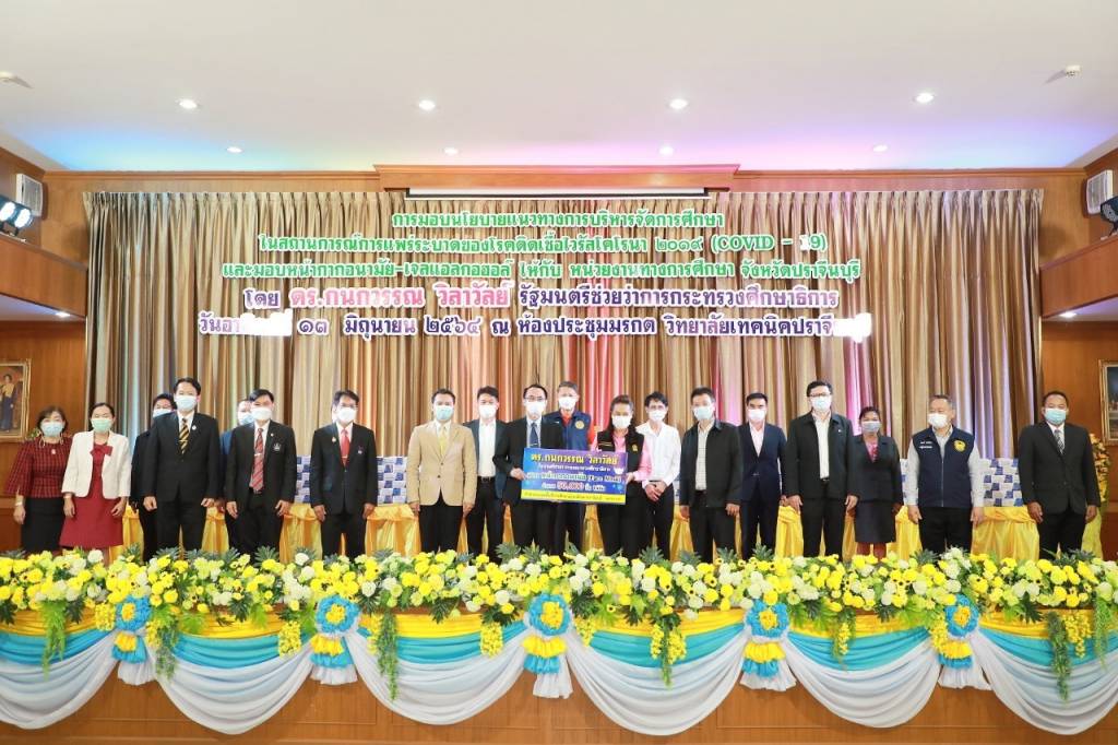 รมช.ศึกษาธิการ กล่าวตอนหนึ่งว่า วันนี้มีความตั้งใจนำหน้ากากอนามัย และอุปกรณ์ป้องกันไวรัสโคโรน่า 2019 (โควิด-19) มามอบให้หน่วยงานทางการศึกษา เพื่อส่งต่อไปยังสถานศึกษาในสังกัดกระทรวงศึกษาธิการ ตลอดจนองค์การบริหารส่วนจังหวัดปราจีนบุรี เพื่อเป็นการเตรียมความพร้อมเปิดภาคเรียน 2564 จำนวนกว่า 220,000 ชิ้น และเจลแอลกอฮอล์ล้างมือจำนวน 2,000 ชิ้น แบ่งเป็น
