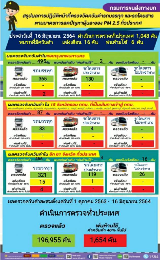 ทั้งนี้ กำชับผู้ประกอบการและเจ้าของรถทุกคันที่ถูกพ่นห้ามใช้ ต้องนำรถไปแก้ไขและนำรถเข้ารับการตรวจสภาพ ณ สำนักงานขนส่ง หากฝ่าฝืนใช้รถโดยที่มีคำสั่งห้ามใช้ มีความผิดตามกฎหมาย ด้านประชาชนสามารถมีส่วนร่วมป้องกันและแก้ไขปัญหาฝุ่นละอองขนาดเล็ก PM2.5 ด้วยการส่งภาพรถบรรทุกและรถโดยสารควันดำที่สังเกตเห็นหมายเลขทะเบียนชัดเจน ให้ศูนย์คุ้มครองผู้โดยสารและรับเรื่องร้องเรียน สายด่วน 1584 ตลอด 24 ชั่วโมง •Line@: @1584DLT •Facebook: 1584 ร้องเรียนรถโดยสารสาธารณะ https://www.facebook.com/dlt1584/ •เว็บไซต์ http://ins.dlt.go.th/cmpweb/ •แอปพลิเคชัน DLT GPS •E-mail: dlt_1584complain@hotmail.com
