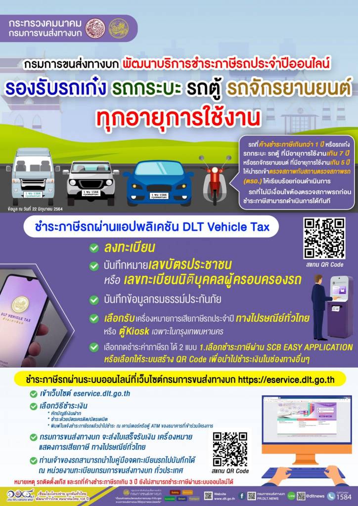 นางพรรณี พุ่มพันธ์ รองอธิบดีกรมการขนส่งทางบก เปิดเผยว่า เพื่อให้เป็นไปตามนโยบายกระทรวงคมนาคม นำโดยนายศักดิ์สยาม ชิดชอบ กรมการขนส่งทางบกมุ่งมั่นพัฒนาบริการชำระภาษีรถประจำปี ตามพระราชบัญญัติรถยนต์ พ.ศ. 2522 เพื่ออำนวยความสะดวกให้เจ้าของรถสามารถชำระภาษีรถประจำปีได้อย่างสะดวกและรวดเร็ว มีหลากหลายช่องทางในการให้บริการ โดยหนึ่งในช่องทางที่เป็นที่นิยมของเจ้าของรถในปัจจุบัน คือ การชำระภาษีรถประจำปีออนไลน์ ซึ่งเดิมระบบออนไลน์จะรองรับเฉพาะรถที่ไม่ต้องผ่านการตรวจสภาพเท่านั้น ส่งผลให้ที่ผ่านมาเจ้าของรถเก๋ง รถกระบะ รถตู้ ที่มีอายุการใช้งานเกิน 7 ปี หรือรถจักรยานยนต์ที่มีอายุการใช้งานเกิน 5 ปี ต้องเลือกใช้บริการผ่านช่องทางอื่นแทน ทั้งนี้ ปัจจุบันกรมการขนส่งทางบกได้พัฒนาช่องทางชำระภาษีรถประจำปีออนไลน์ให้รองรับรถยนต์และรถจักรยานยนต์ตามพระราชบัญญัติรถยนต์ พ.ศ. 2522 ได้ทุกอายุการใช้งานแล้ว เป็นการยกระดับการให้บริการประชาชนได้ครอบคลุมยิ่งขึ้น โดยเจ้าของรถสามารถชำระภาษีรถออนไลน์ ได้ที่ เว็บไซต์กรมการขนส่งทางบก https://eservice.dlt.go.th หรือผ่านแอปพลิเคชัน DLT Vehicle Tax กรณีเป็นรถที่ค้างชำระภาษีเกินกว่า 1 ปี หรือรถเก๋ง รถกระบะ รถตู้ ที่มีอายุการใช้งานเกิน 7 ปี หรือรถจักรยานยนต์ที่มีอายุการใช้งานเกิน 5 ปี ให้นำรถเข้าตรวจสภาพกับสถานตรวจสภาพรถ (ตรอ.) ให้เรียบร้อยก่อนดำเนินการ ส่วนรถที่ไม่มีเงื่อนไขต้องตรวจสภาพรถก่อนชำระภาษีสามารถดำเนินการได้ทันที บริการออนไลน์ดังกล่าวอำนวยความสะดวกสามารถชำระภาษีรถประจำปีล่วงหน้าได้ภายใน 90 วัน ก่อนวันที่ภาษีรถสิ้นอายุ โดยเลือกชำระเงินผ่าน e-Banking บัตรเครดิต บัตรเดบิต เคาน์เตอร์ธนาคารหรือสถาบันการเงินที่เข้าร่วมโครงการ ทำให้ไม่ต้องเดินทางมาที่สำนักงานขนส่ง อยู่ที่ไหนก็สามารถชำระภาษีรถประจำปีได้ รอรับเครื่องหมายการเสียภาษีและใบเสร็จรับเงินทางไปรษณีย์ ภายใน 5 วันทำการ นับจากวันชำระเงิน อย่างไรก็ตาม บริการชำระภาษีรถออนไลน์ยังมีข้อจำกัดสำหรับรถบางประเภท เช่น รถติดตั้งแก๊ส และรถที่ค้างชำระภาษีรถเกิน 3 ปี ยังไม่สามารถชำระภาษีผ่านระบบออนไลน์ได้