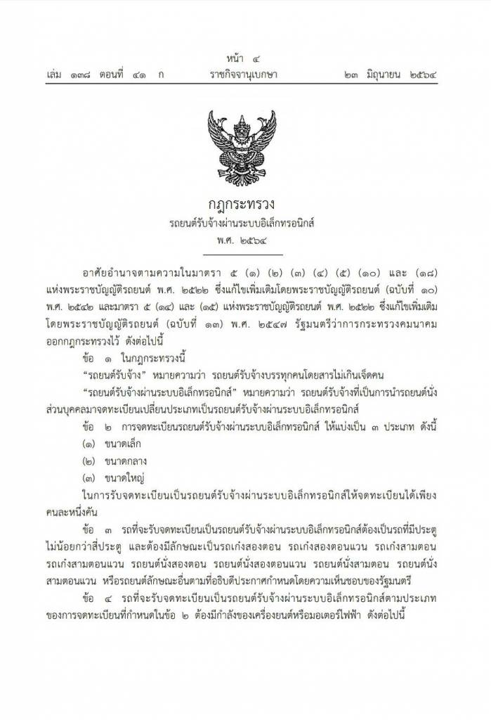 ทั้งนี้ ในการรับจดทะเบียนเป็นรถยนต์รับจ้างผ่านระบบอิเล็กทรอนิกส์นั้น ให้จดทะเบียนได้เพียงคนละ 1 คัน ขณะที่ รถที่จะรับจดทะเบียนเป็นรถยนต์รับจ้างผ่านระบบอิเล็กทรอนิกส์ ต้องเป็นรถที่มีประตูไม่น้อยกว่า 4 ประตู และต้องมีลักษณะเป็นรถเก๋ง 2 ตอน, รถเก๋ง 2 ตอนแวน, รถเก๋ง 3 ตอน, รถเก๋ง 3 ตอนแวน, รถยนต์นั่ง 2 ตอน, รถยนต์นั่ง 2 ตอนแวน, รถยนต์นั่ง 3 ตอน, รถยนต์นั่ง 3 ตอนแวน หรือรถยนต์ลักษณะอื่นตามที่อธิบดี ขบ. ประกาศกําหนด โดยความเห็นชอบของรัฐมนตรี