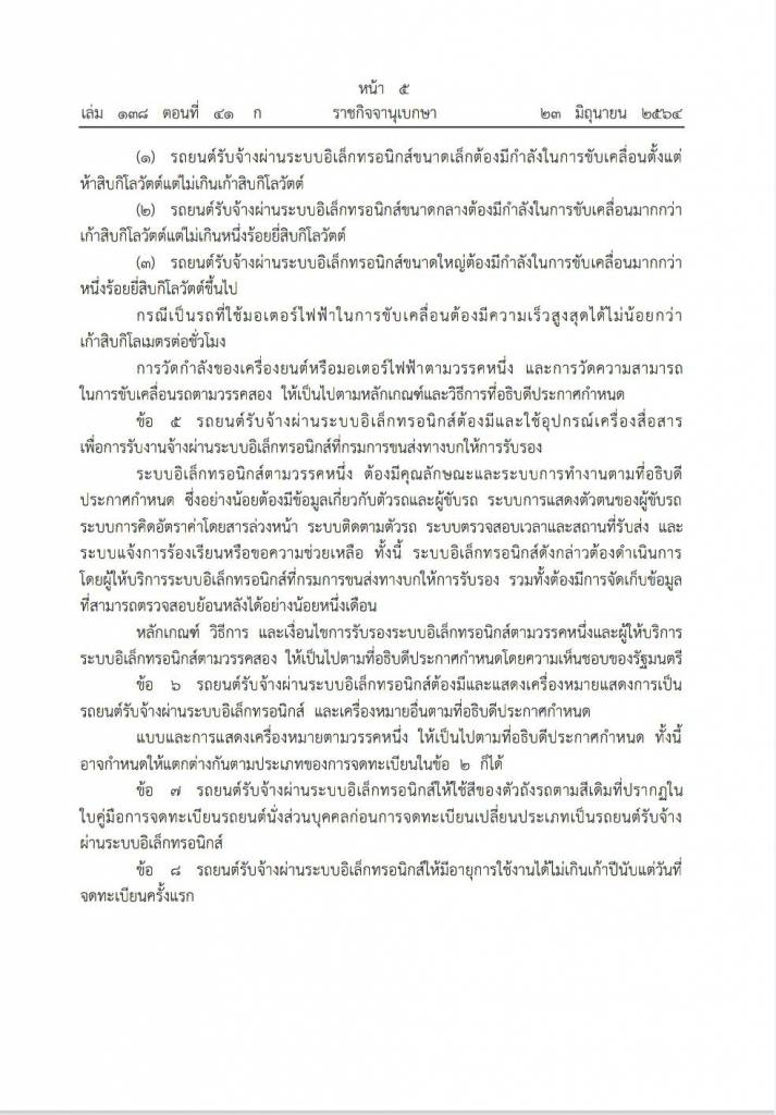 สำหรับสาระสำคัญของกฎกระทรวงฯ นั้น นายศักดิ์สยาม กล่าวว่า ได้แบ่งการจดทะเบียนรถยนต์รับจ้างผ่านระบบอิเล็กทรอนิกส์เป็น 3 ประเภท ได้แก่ 1.ขนาดเล็ก มีกําลังในการขับเคลื่อนตั้งแต่ 50-90 กิโลวัตต์ 2.ขนาดกลาง มีกําลังในการขับเคลื่อนมากกว่า 90 กิโลวัตต์ แต่ไม่เกิน 120 กิโลวัตต์ และ 3.ขนาดใหญ่ มีกําลังในการขับเคลื่อนมากกว่า 130 กิโลวัตต์ขึ้นไป ทั้งนี้ กรณีเป็นรถที่ใช้มอเตอร์ไฟฟ้าในการขับเคลื่อนต้องมีความเร็วสูงสุดได้ไม่น้อยกว่า 90 กิโลเมตรต่อชั่วโมง