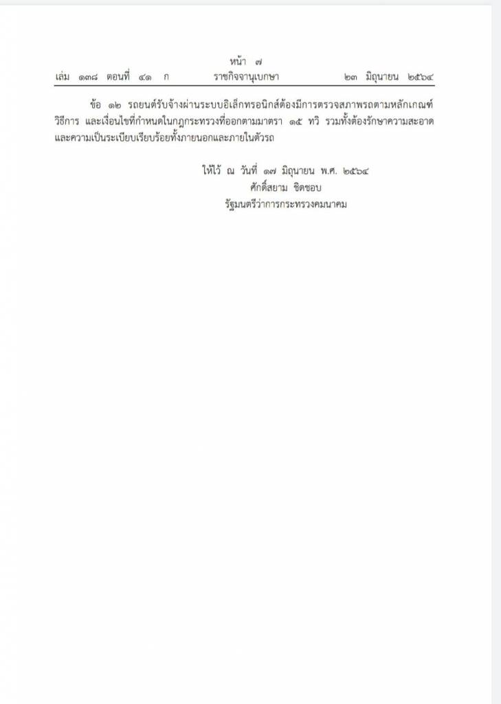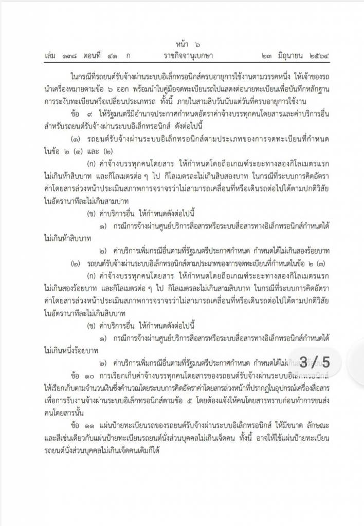 นายศักดิ์สยาม กล่าวอีกว่า ส่วนอัตราค่าจ้างบรรทุกคนโดยสารและค่าบริการอื่น สําหรับรถยนต์รับจ้างผ่านระบบอิเล็กทรอนิกส์ ได้กำหนดไว้ว่า รถยนต์รับจ้างผ่านระบบอิเล็กทรอนิกส์ขนาดเล็ก และขนาดกลาง ให้กําหนดโดยถือเกณฑ์ระยะทาง 2 กิโลเมตร (กม.) แรก ไม่เกิน 50 บาท และ กม.ต่อๆ ไป กม.ละไม่เกิน 12 บาท ในกรณีที่ระบบการคิดอัตราค่าโดยสารล่วงหน้าประเมินสภาพการจราจรว่า ไม่สามารถเคลื่อนที่หรือเดินรถต่อไปได้ตามปกติวิสัย ในอัตรานาทีละไม่เกิน 3 บาท ในส่วนกรณีการจ้างผ่านศูนย์บริการสื่อสารหรือระบบสื่อสารทางอิเล็กทรอนิกส์ กําหนดได้ไม่เกิน 50 บาท และค่าบริการเพิ่มกรณีอื่น กําหนดได้ไม่เกิน 200 บาท