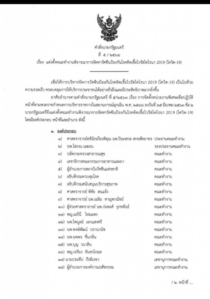 ต่อมา พล.อ.ประยุทธ์ ได้ลงนามในคำสั่งนายกรัฐมนตรี แต่งตั้งคณะทำงานพิจารณาการจัดหาวัคซีนป้องกันโรคติดเชื้อไวรัสโคโรนา 2019 เพื่อให้การบริหารจัดการวัคซีนเป็นไปด้วยความรวดเร็ว ครอบคลุมการให้บริการประชาชนได้อย่างทั่วถึง และมีประสิทธิภาพมากยิ่งขึ้น จึงแต่งตั้ง นพ.ปิยะสกล สกลสัตยาทร เป็นประธาน และมีกรรมการร่วม โดยมี นพ.บุญ วนาสิน ประธานกรรมการบริษัท ธนบุรี เฮลท์แคร์ จำกัด(มหาชน) ซึ่งเป็นตัวแทนภาคเอกชน ร่วมอยู่ด้วย เพื่อหารือถึงแนวทางให้ได้ข้อสรุปภายใน 30 วัน พูดง่ายๆ คือ วัคซีนทางเลือกเช่นโมเดอร์นา นั้น เป็นงานของคณะกรรมการชุดท่านทั้งสอง ผมจึงเห็นว่า